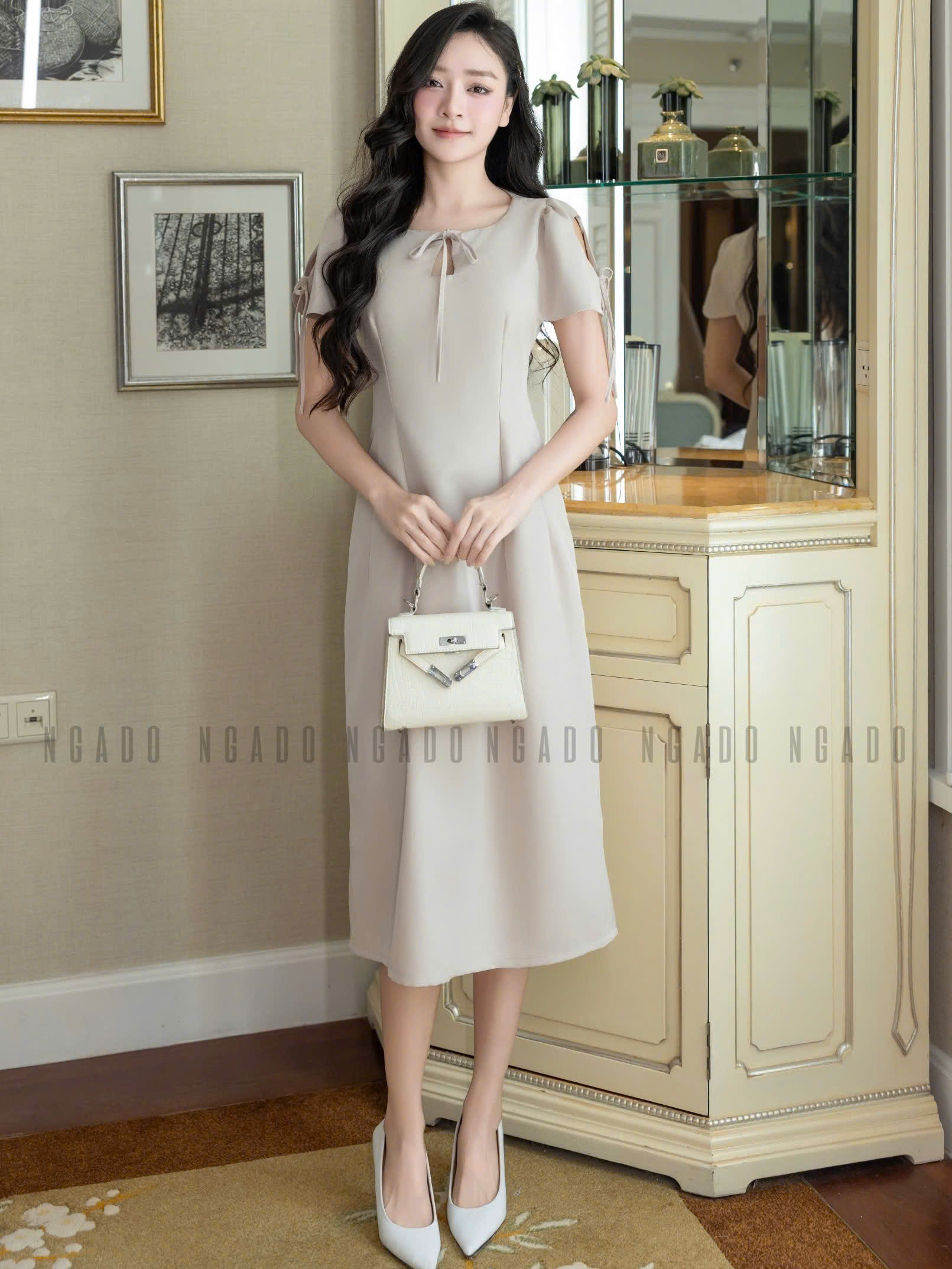 ✨Đầm nude kem cổ giọt nước NGADO , đầm dài , đâm dự tiệc , công sở