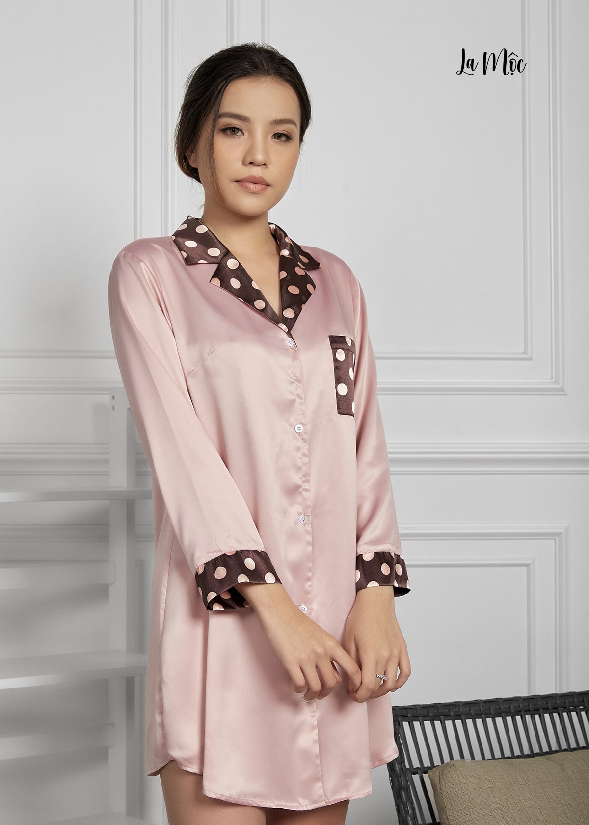 Đầm Pijama truyền thống Satin lụa Hàn Quốc màu hồng, đầm gài nút. Cổ đan tông kết hợp túi áo vuông một bên, tay dài phối họa tiết nền nâu chấm bi trắng. Tà bầu.