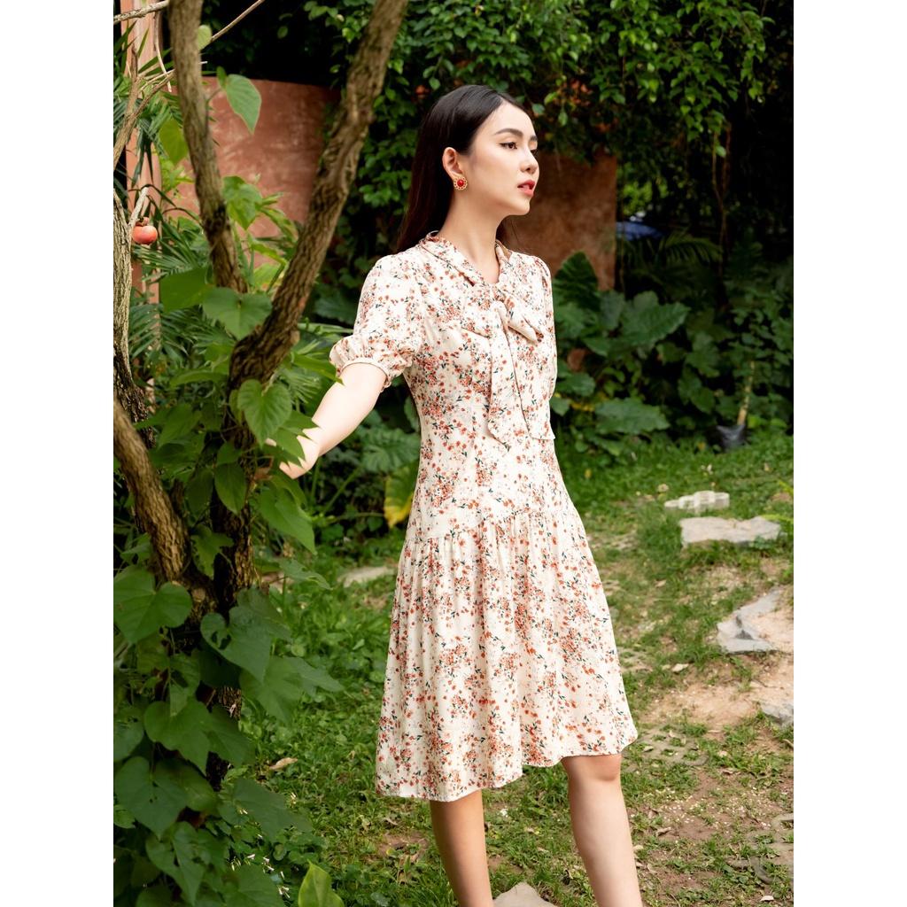 Đầm xẻ trước dáng suông tay phồng ngắn dây cột nơ cổ của T&M
