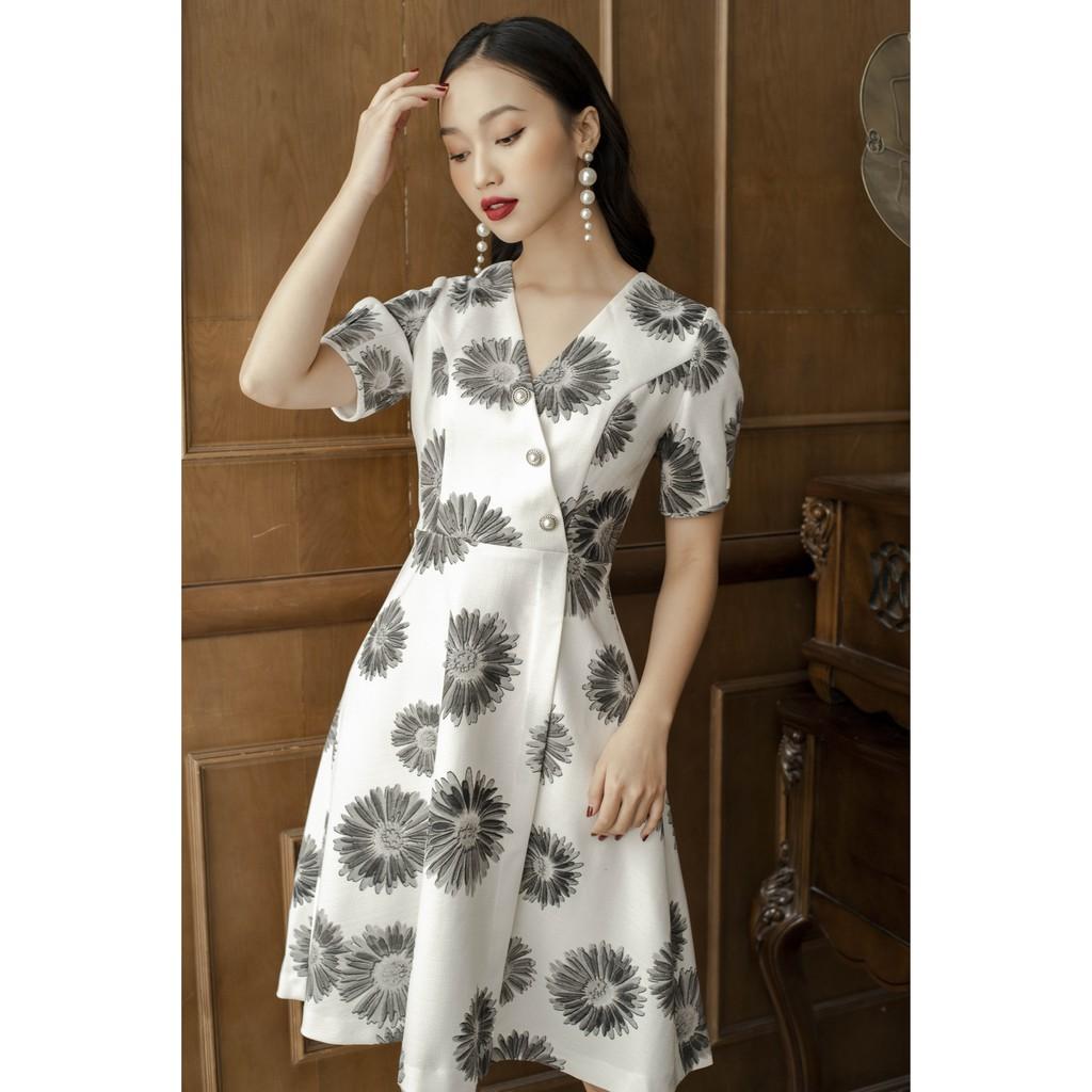 ✨Đầm xòe hoa cúc Tri'C Luxury cổ V tay bồng Trắng A16420