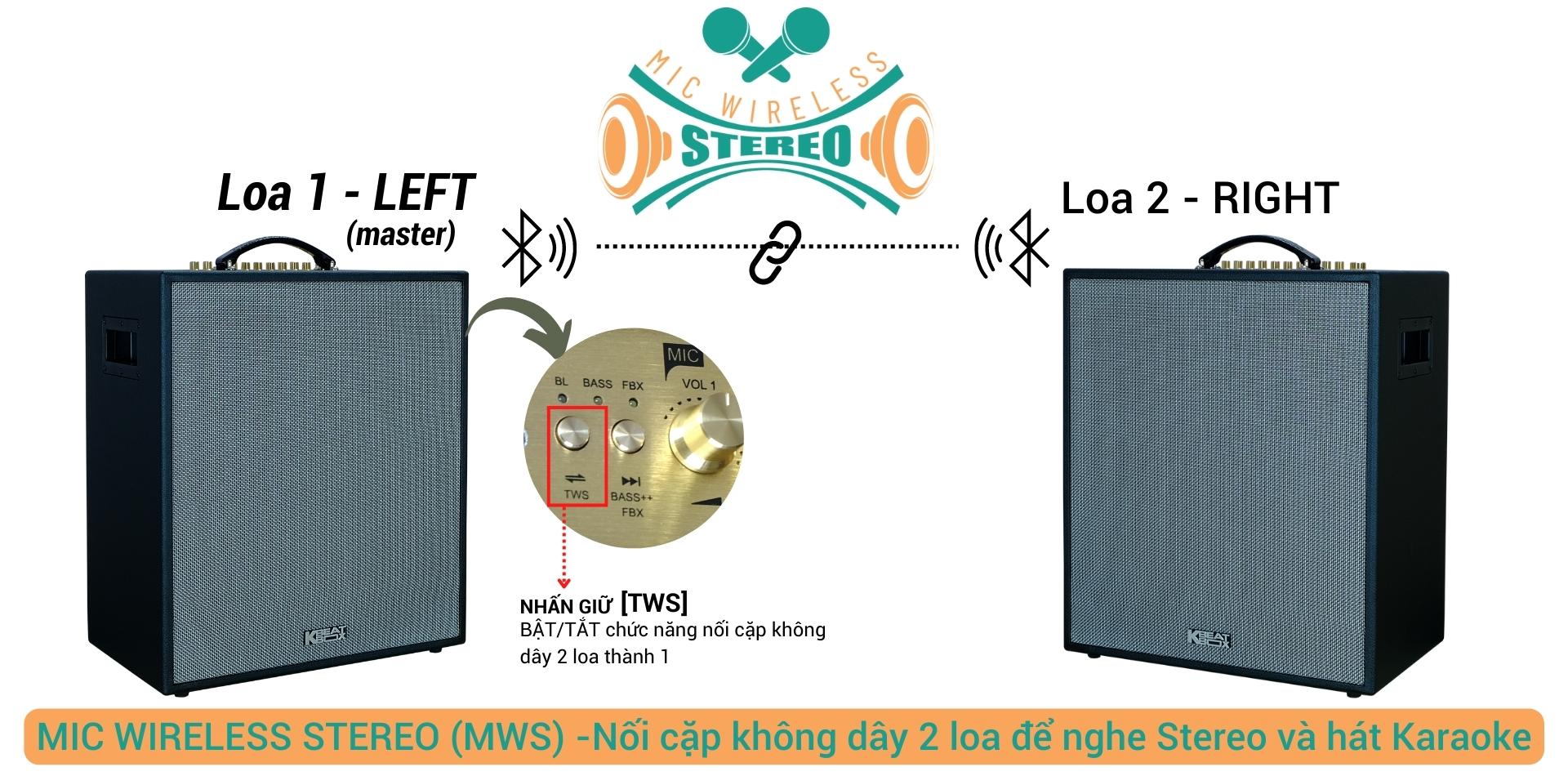 Mic Wireless Stereo (MWS) là tính năng nối cặp không dây 2 loa để nghe Stereo và hát Karaoke.