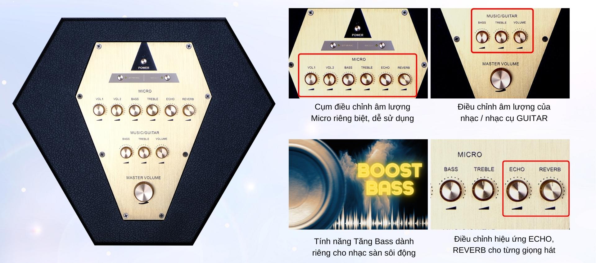 Cụm điều chỉnh Micro riêng biệt bao gồm: Âm lượng từng micro, âm Bass, Âm Treble, ECHO (độ vang của giọng hát / giọng nói), REVERB (hiệu ứng vọng lại của giọng hát / giọng nói)