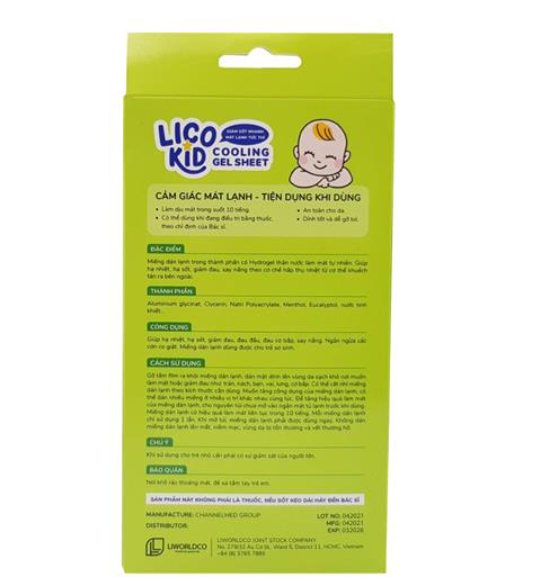 DÁN HẠ SỐT LICO KID Miếng dán chườm lạnh, hạ sốt nhanh Cooling Sheet với ưu điểm giảm sốt nhanh chóng, kéo dài đến 10 giờ và tuyệt đối an toàn khi sử dụng với các loại thuốc khác, cảm giác thoải mái sau khi sử dụng. Sản phẩm có thể sử dụng được cho trẻ sơ sinh và người lớn trong các trường hợp đau răng, làm mát, chùm vết thương bị bỏng Thành phần: Gel nước 100% mát lạnh. Công dụng: Giảm sốt, đau răng, nhức đầu, nóng trong người nhanh chóng mang lại cảm giác dễ chịu khi sử dụng. Cách sử dụng: Gỡ bỏ miếng phim và dán mặt dính vào nơi muốn làm mát. Đặt miếng dán vào tủ lạnh trước khi sử dụng để tăng cảm giác mát lạnh, không bảo quản trong tủ đá. Bảo quản:  Nơi khô ráo thoáng mát, tránh ánh nắng trực tiếp. Xuất xứ thương hiệu: VIỆT NAM Sản xuất tại: VIỆT NAM *Sản phẩm 100% chính hãng, mẫu mã có thể thay đổi theo lô hàng của NSX