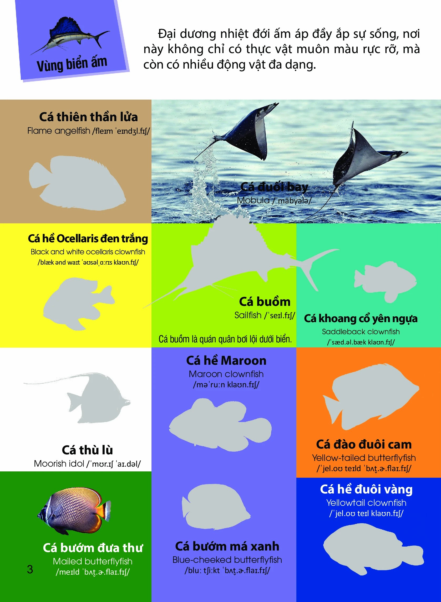 Song ngữ Việt - Anh: Cuốn sách được thiết kế song ngữ Việt - Anh, giúp bé làm quen với từ vựng tiếng Anh về các loài động vật biển một cách tự nhiên và hiệu quả.