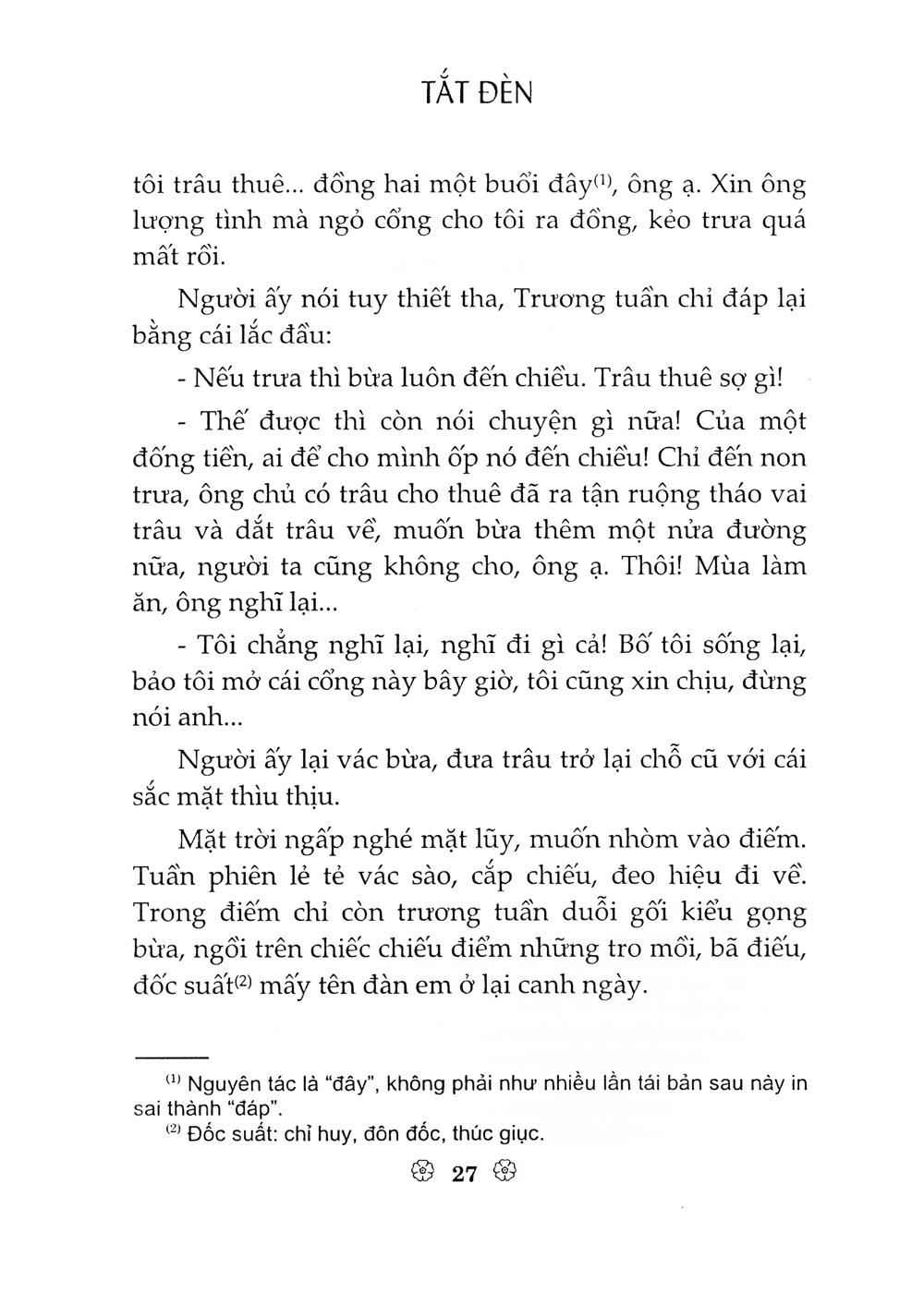 "Theo tôi tiên tri, thì cuốn Tắt đèn còn phải sống lâu thọ hơn cả một số văn gia đương kim hôm nay. Chị Dậu, đích là tác giả Ngô Tất Tố hóa thân ra mà thôi. Chị Dậu là cái đốm sáng đặc biệt của Tắt đèn. Nếu ví toàn truyện Tắt đèn là một khóm cây thì chị Dậu là cả gốc cả ngọn cả cành, và chính chị Dậu đã nổi gió lên mà rung cho cả cái cây dạ hương Tắt đèn đó lên."