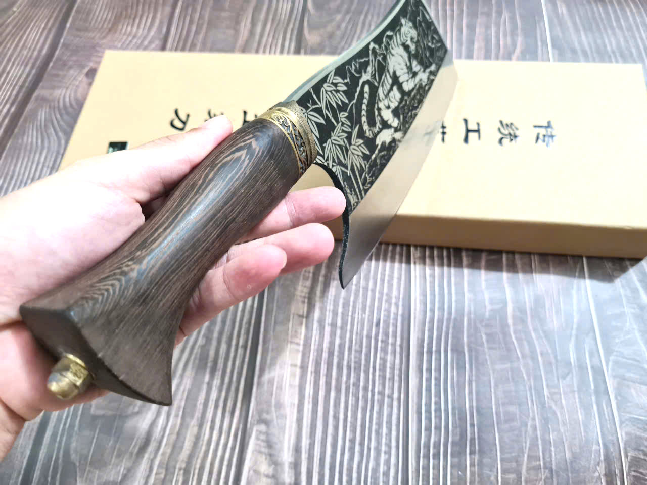 - Chức năng: Chặt xương ống, chân giò, trâu bò - Kích thước: Lưỡi: 22cm, cán: 10cm, rộng: 10cm, dầy: 5ly, trọng lượng: 800g - Cán : Gỗ mun, Khâu đồng đỏ , chốt đinh