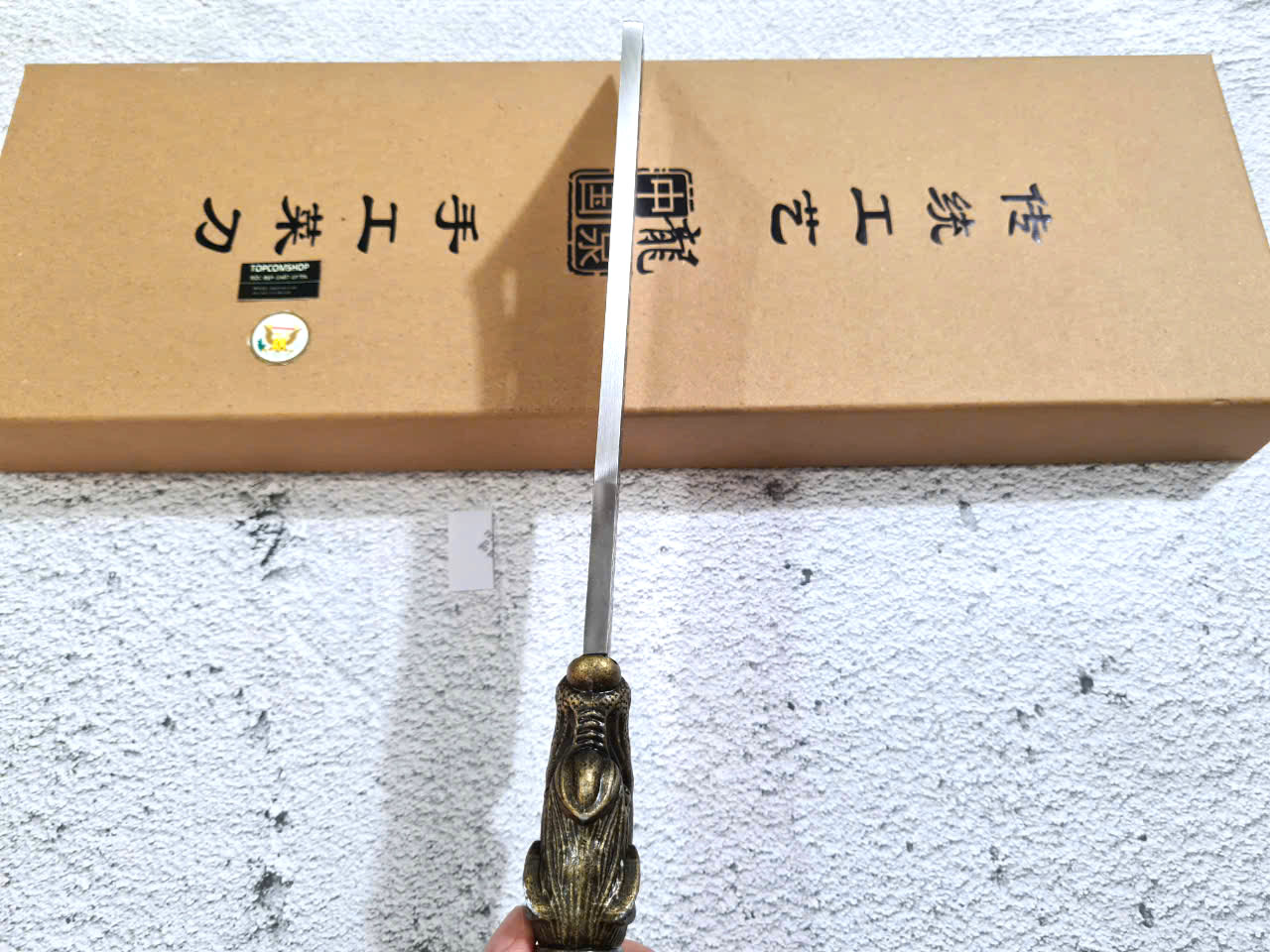 - DAO TR12 : Chiều dài TỔNG: 45cm Chiều dài lưỡi: 24.5cm Chiều rộng lưỡi: 7.5cm, Độ dày lưỡi: 6mm Trọng lượng: 1kg chất liệu lưỡi : 7Cr17MOV (thép 7 crom 17 molypden vanadi) Chất liệu tay cầm: gỗ cẩm lai, phụ kiện khâu đầu hổ và chuôi bằng đồng