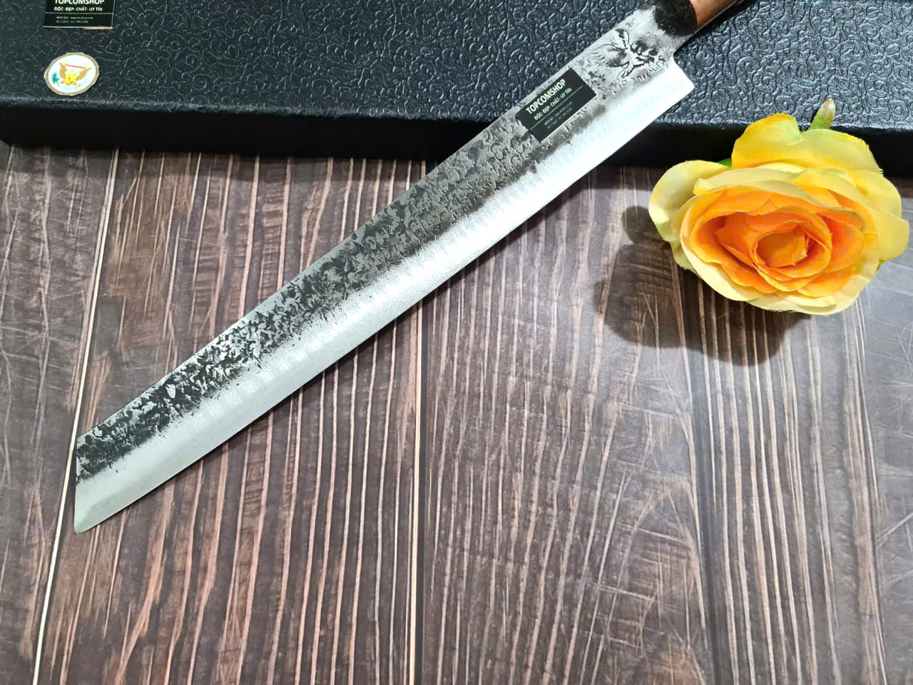 DAO BẾP SASHIMI MẶT HOA VĂN MÃ N4 THÔNG TIN SẢN PHẨM TỔNG DÀI : 45cm, LƯỠI: 30cm,RỘNG : 4cm, dày: 2.5mm, CHẤT liệu lưỡi: thép IFA cao cấp Chất liệu CÁN: gỗ Cẩm chỉ,