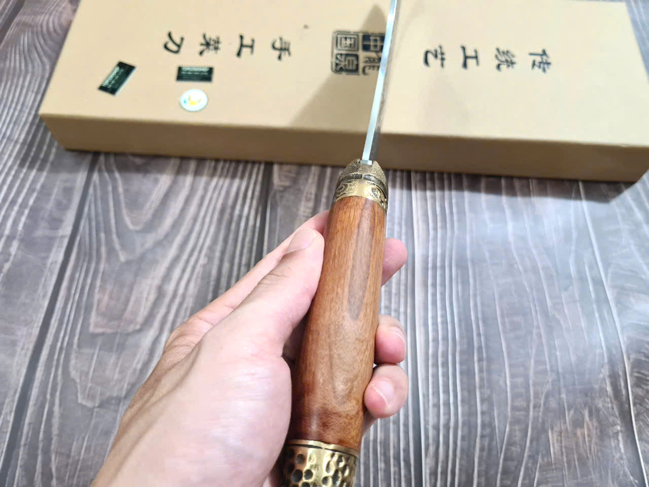 Chất liệu tay cầm: gỗ CẨM LAI, khâu và chuôi cuối dao bằng đồng thau