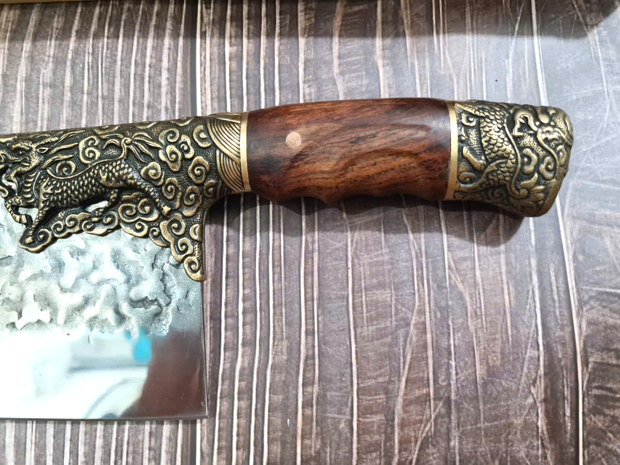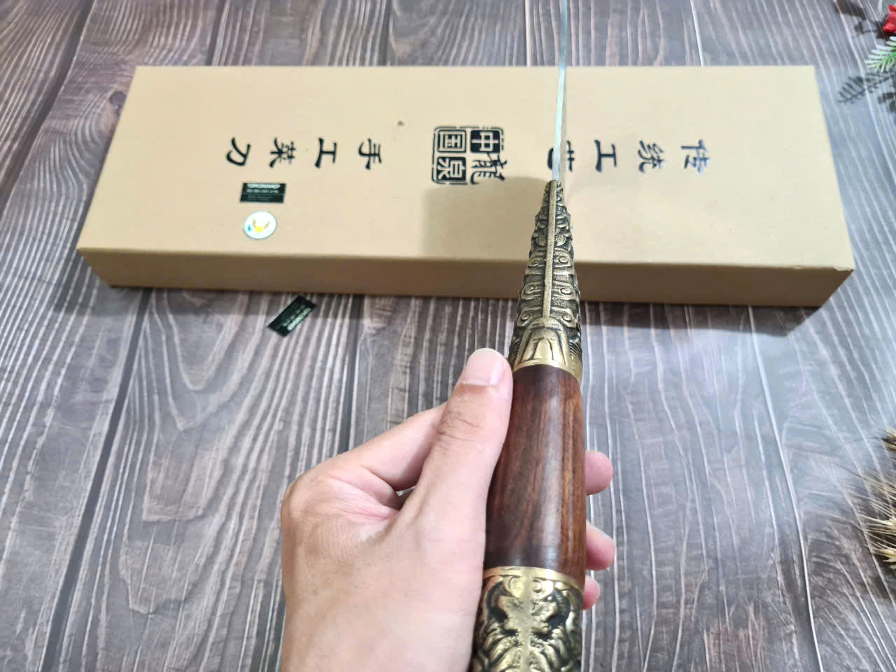 Chất liệu tay cầm: gỗ CẨM LAI, khâu và chuôi cuối dao bằng đồng thau