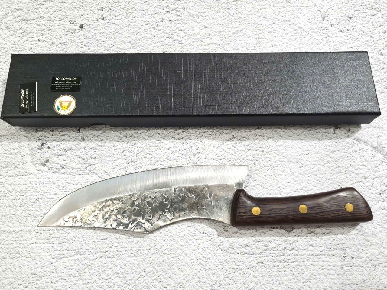 -THÔNG TIN SẢN PHẨM: Chiều dài tổng thể: 29.5cm, Chiều dài lưỡi: 19.5cm ,Chiều rộng lưỡi: 5cm Độ dày: 2.5MM, CHẤT liệu lưỡi: 5Cr15MOV (thép 5 crom 15 molypden vanadi) Chất liệu CÁN: gỗ Cánh gà NẶNG : 2.5 lạng Mặt D dập chìm hoa văn rất đẹp