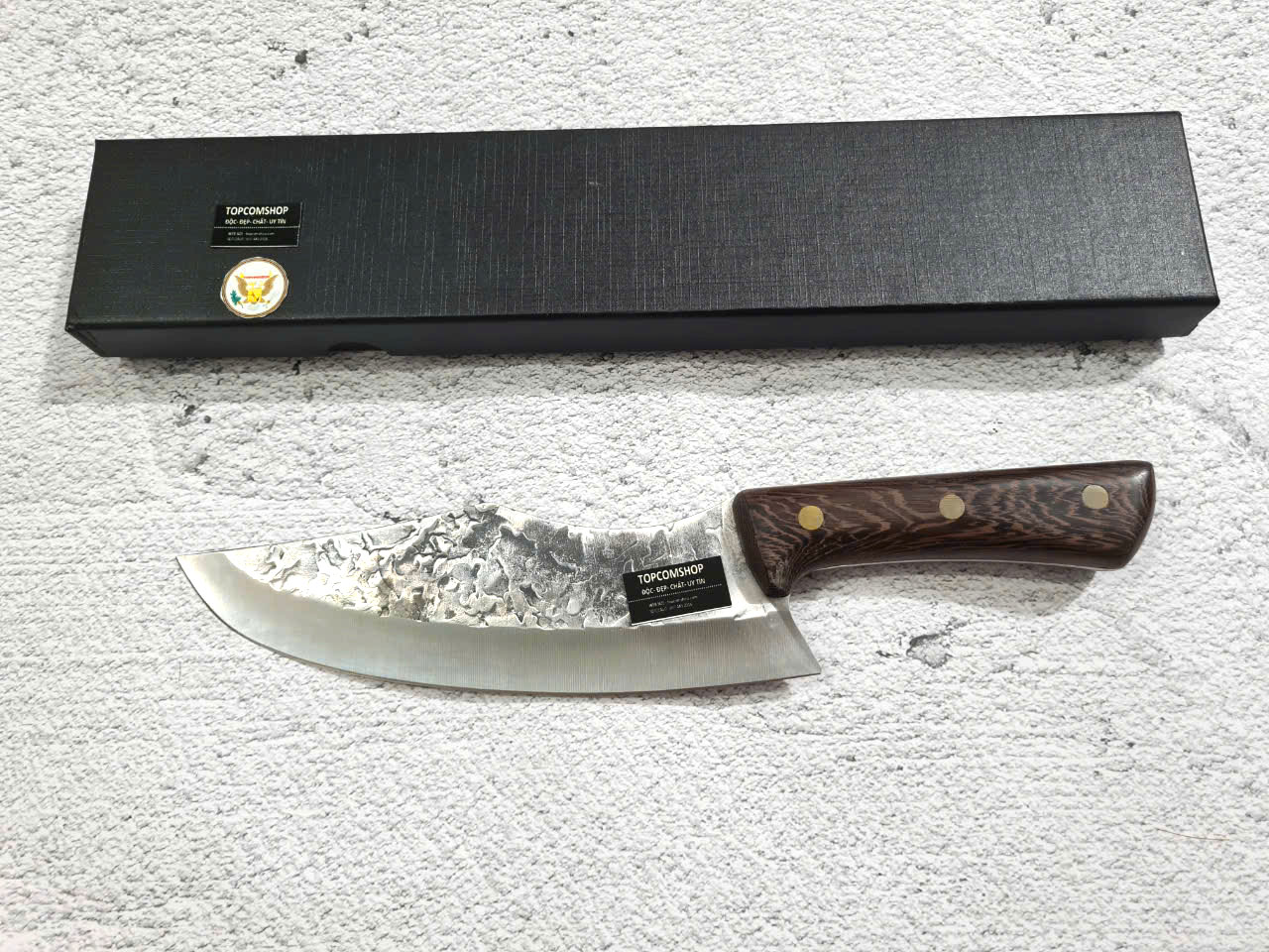 -THÔNG TIN SẢN PHẨM: Chiều dài tổng thể: 29.5cm, Chiều dài lưỡi: 19.5cm ,Chiều rộng lưỡi: 5cm Độ dày: 2.5MM, CHẤT liệu lưỡi: 5Cr15MOV (thép 5 crom 15 molypden vanadi) Chất liệu CÁN: gỗ Cánh gà NẶNG : 2.5 lạng Mặt D dập chìm hoa văn rất đẹp