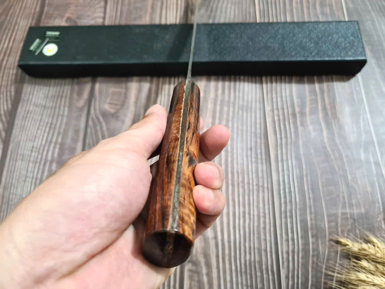 Cán dao làm từ gỗ cẩm chỉ sang trọng, tay cầm hơi phình ở giữa giúp cầm nắm chắc chắn hơn.