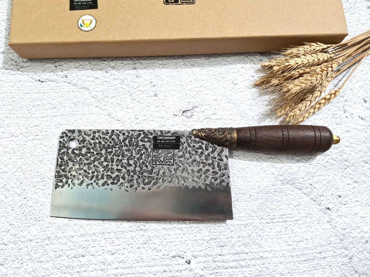 - Chức năng: Chặt xương ống, chân giò, trâu bò - Kích thước: Lưỡi: 22cm, cán: 10cm, rộng: 10cm, dầy: 5ly, trọng lượng: 800g - Cán : Gỗ mun, Khâu đồng đỏ , chốt đinh