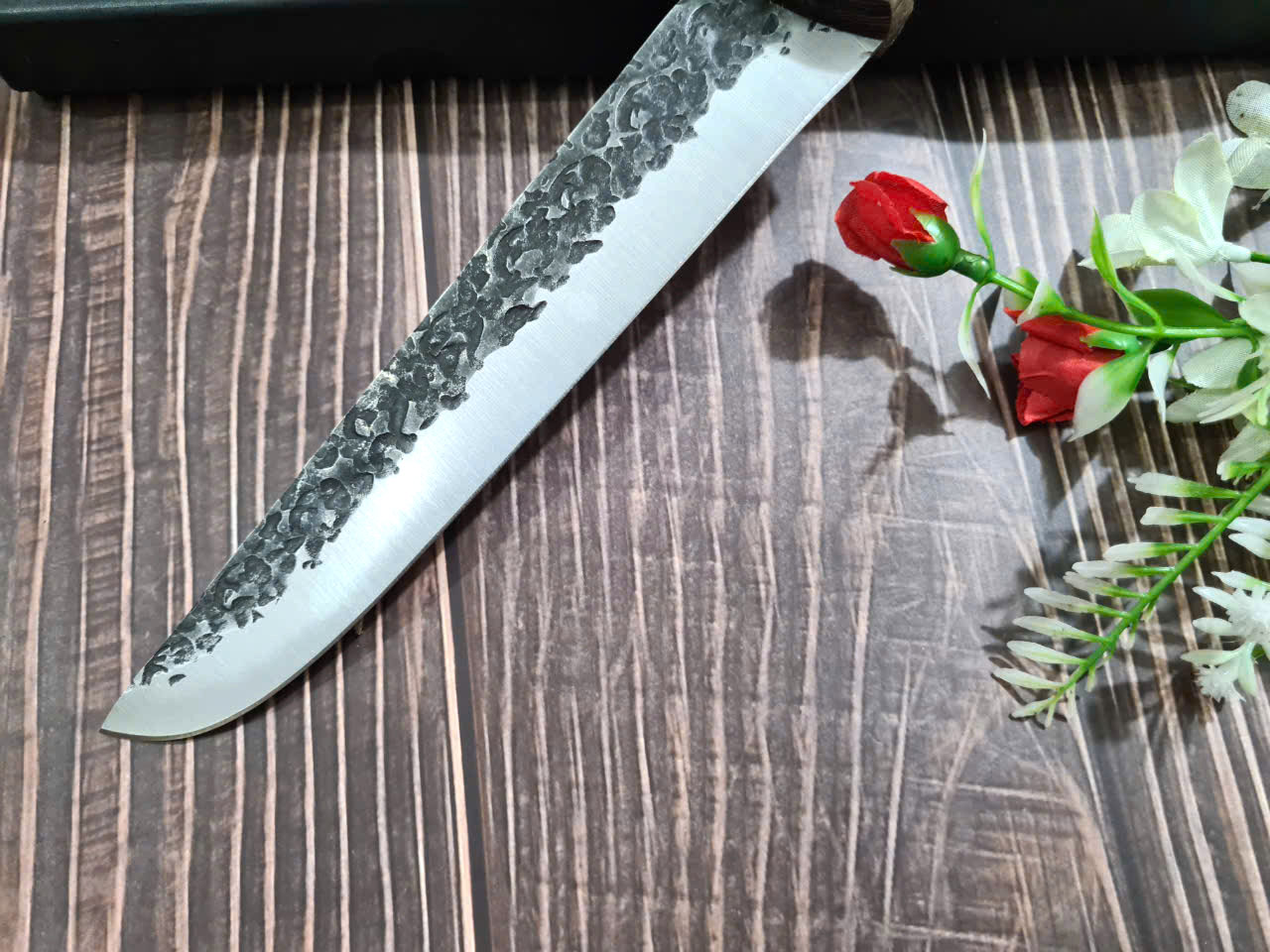 • Chất liệu: Thép Nhật 420J2, độ cứng 53HRC – siêu bền, chống gỉ • Lưỡi dao: Dày 2.5mm, sắc bén, hoàn thiện bằng đá mài nước • Tay cầm: Gỗ Pakka sang trọng, chống
