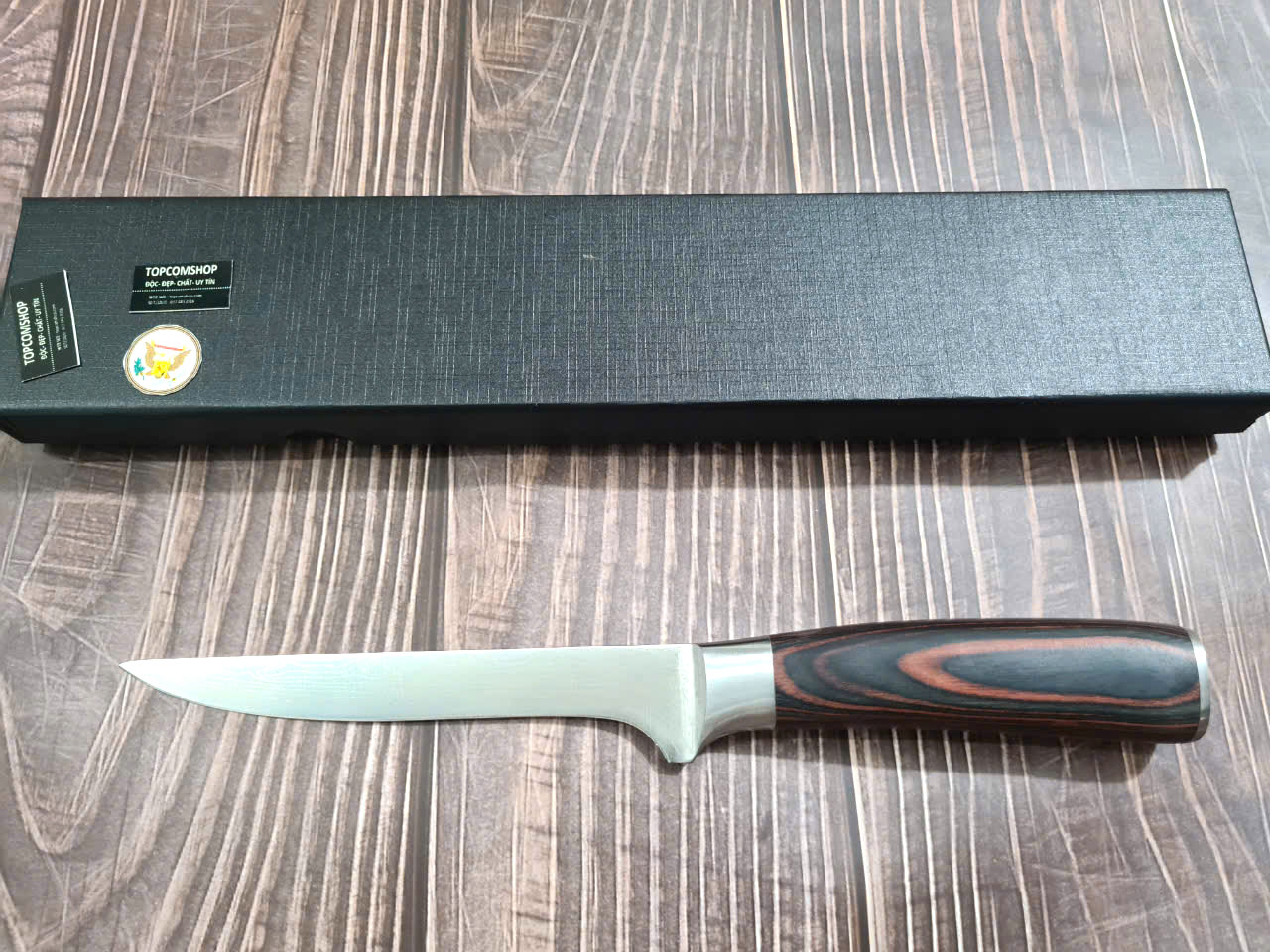 Dao lọc 15 cán ốp cẩm - DL15OCD - Kích thước: lưỡi: 18cm, cán: 12cm, rộng: 3.5cm, dầy: 1.5ly, trọng lượng: 200g - Chức năng: sử dụng chuyên thái lọc thịt ,cá, rau củ và