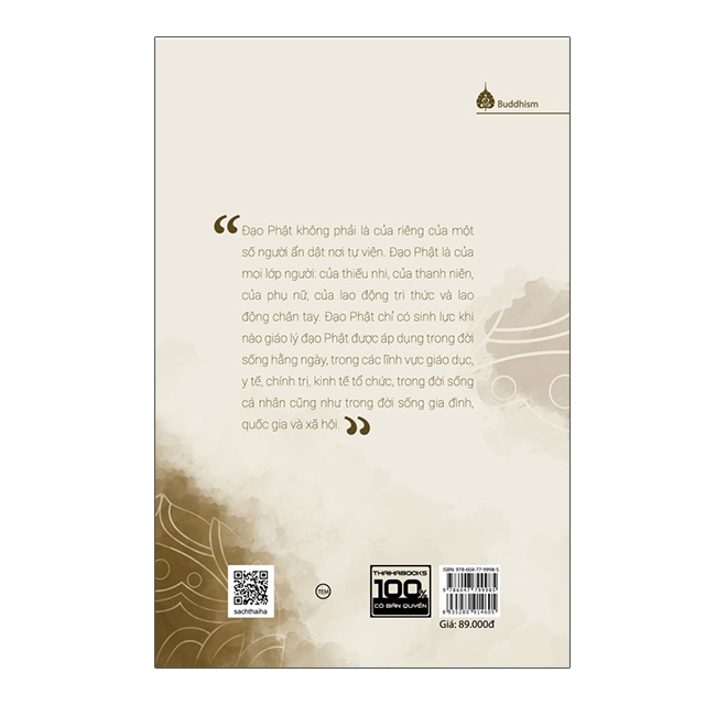[ThaiHaBooks] Qua cuốn sách này, Thiền sư Thích Nhất Hạnh và Hòa thượng Thích Huyền Quang đáng kính đã hết sức nhấn mạnh tầm quan trọng của việc ứng dụng các giáo lý nhà Phật vào thế giới đương đại của chúng ta. Bằng niềm tin vững chắc, cuốn sách cho thấy tính khả dĩ vượt thời gian của Phật giáo trong việc điều hướng xã hội đương đại cùng tất cả những vấn đề phức tạp của nó. Từ giáo dục, y tế, chính trị, kinh tế, cơ cấu xã hội đến đời sống cá nhân và các vấn đề gia đình, hai tác giả nhiệt tình ủng hộ tích hợp các giáo lý sâu sắc vào Phật pháp.