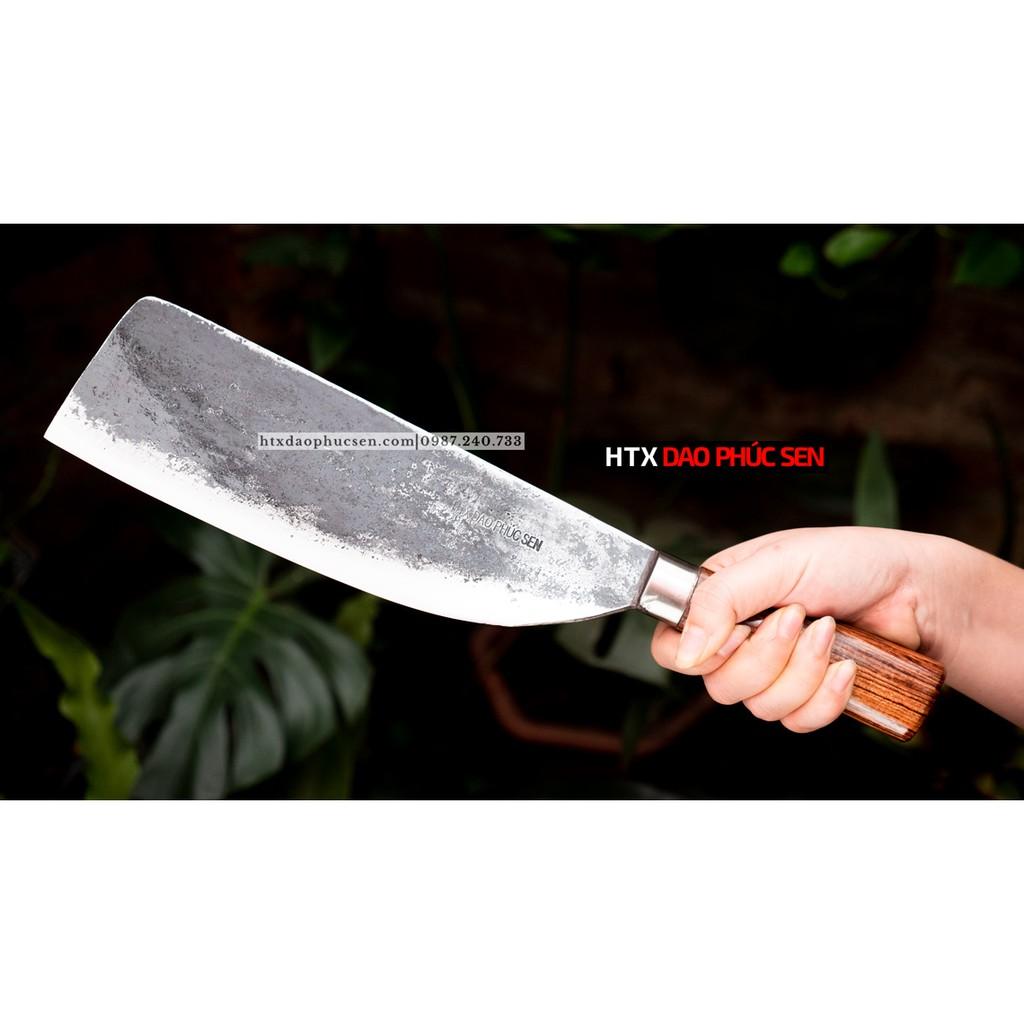 Mua tại TiktokDao Phúc Sen Dao Phay Chặt Gà- CG1 . Chất liệu: 100% nhíp ô tô . Kích thước: chiều dài lưỡi :27cm - chiều dài cán: 12cm - chiều rộng: 7,5cm - Độ dầy: 3ly- Trọng lượng: 500g . Dùng chặt gà , vịt và các loại xương mềm như xương sườn . Chuôi dao được làm từ gỗ cẩm chỉ, khâu và chốt đinh làm từ inox 304