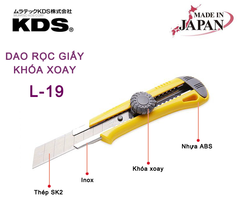 • Dao rọc giấy khóa xoay KDS L-19 đạt tiêu chuẩn chất lượng Công Nghiệp Nhật (JIS). Được thiết kế tinh tế và chú trọng sự an toàn với lưỡi dao được lồng vào trong cán cầm, khi không sử dụng bạn có thể trượt lưỡi dao vào bên trong, đảm bảo an toàn cho bản thân và mọi người. Giúp bạn làm việc cực kỳ an toàn không ảnh hưởng đến người lao động.