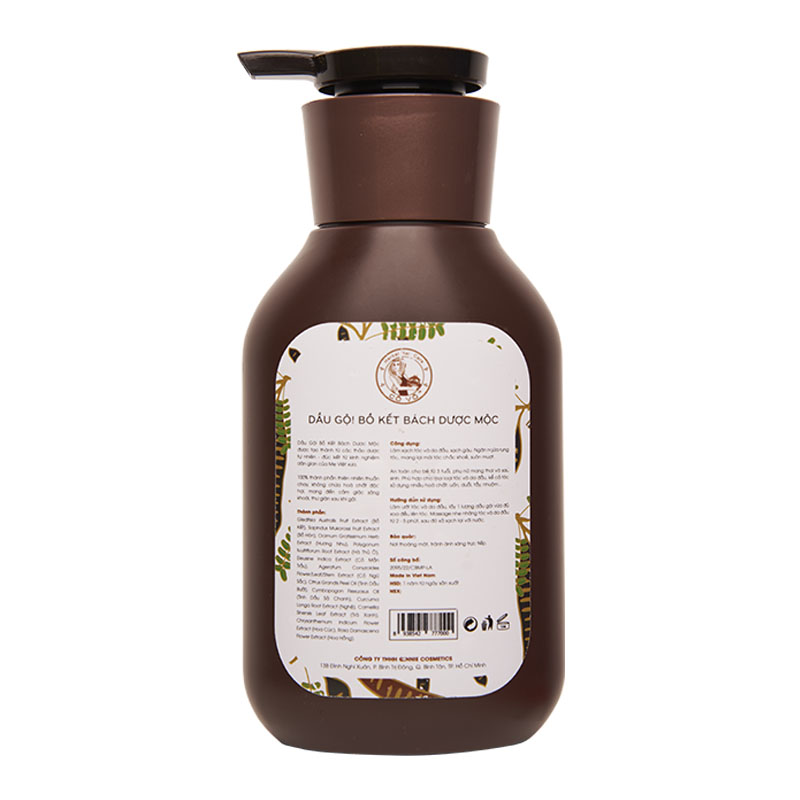 Thành Phần : Gleditsia australis Fruit Extract (Bồ Kết), Sapindus mukorossi Fruit Extract (Bồ Hòn), Ocimum gratissimum Herb Extract (Hương Nhu), Polygonum multiflorum Root Extract (Hà Thủ Ô), Eleusine indica Extract ( Cỏ Mần Trầu), Ageratum conyzoides Flower/Leaf/Stem Extract (Cỏ Ngũ Sắc), Citrus Grandis peel oil (Tinh Dầu Bưởi), Cymbopogon flexuosus oil (Tinh Dầu Sả Chanh), Curcuma Longa Root Extract(Nghệ), Camellia sinensis Leaf Extract (Trà Xanh), Chrysanthemum Indicum Flower Extract ( Hoa Cúc), Rosa Damascena Flower Extract ( Hoa Hồng)