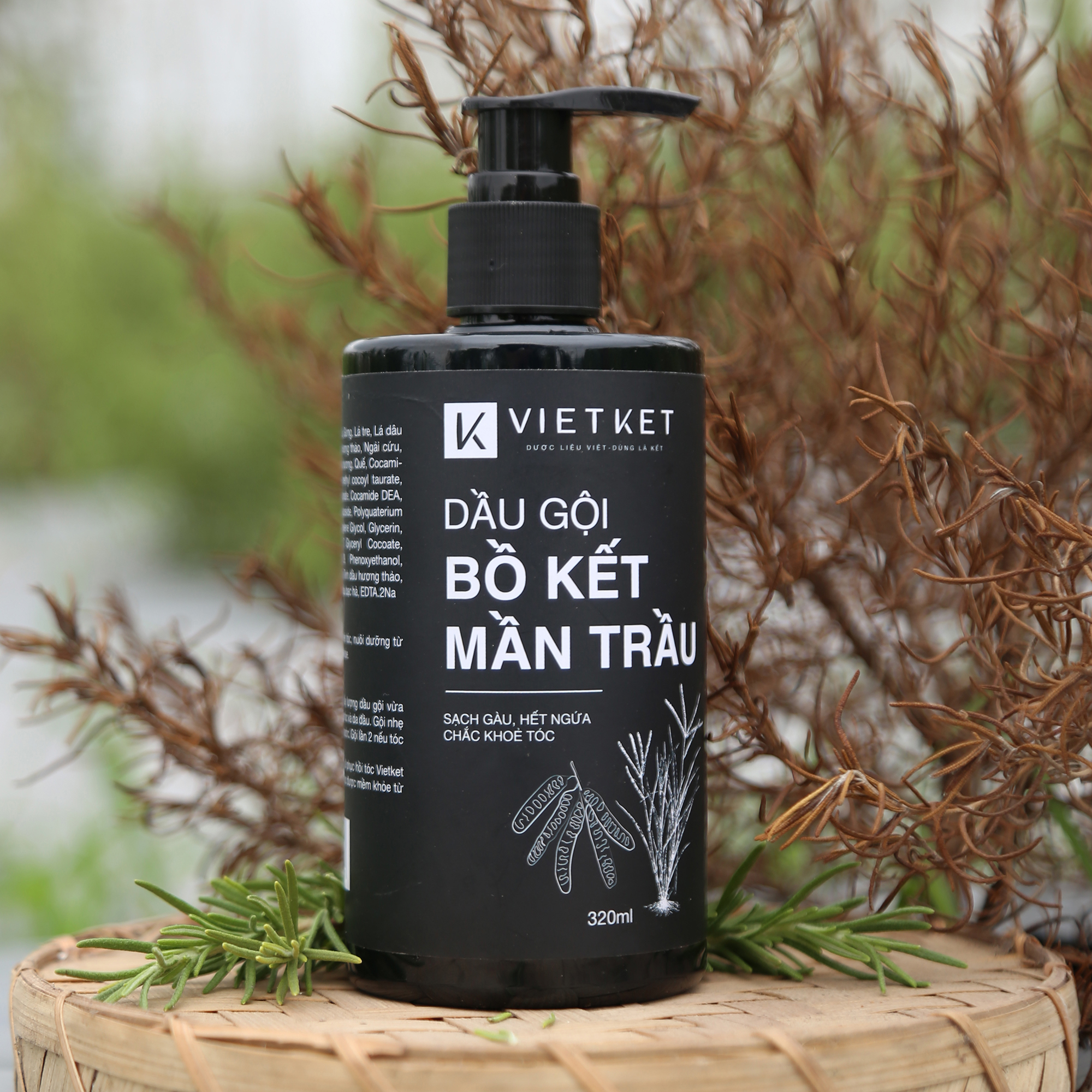 Dầu Gội Bồ Kết Mần Trầu VIETKET 320ml - Sạch gàu, hết ngứa, chắc khoẻ tócTHÀNH PHẦN:Nước, Bồ kết khô, Mần trầu, Gừng, Lá tre, Lá dâu tằm, Tía tô , Hương nhu, Hương thảo, Ngải cứu, Hà thủ ô khô , Bạc...