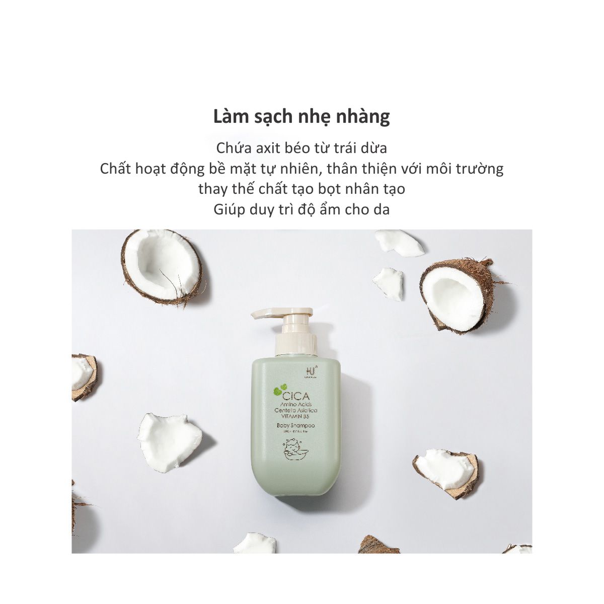 - Axit amin: Axit amin phong phú kết hợp với axit béo từ dừa nhanh chóng hấp thụ dầu thừa và bụi bẩn, đồng thời làm sạch da đầu một cách nhẹ nhàng. • Chiết xuất tinh chất từ rau má CICA được trồng trên những vùng đất sạch, an toàn tuyệt đối.