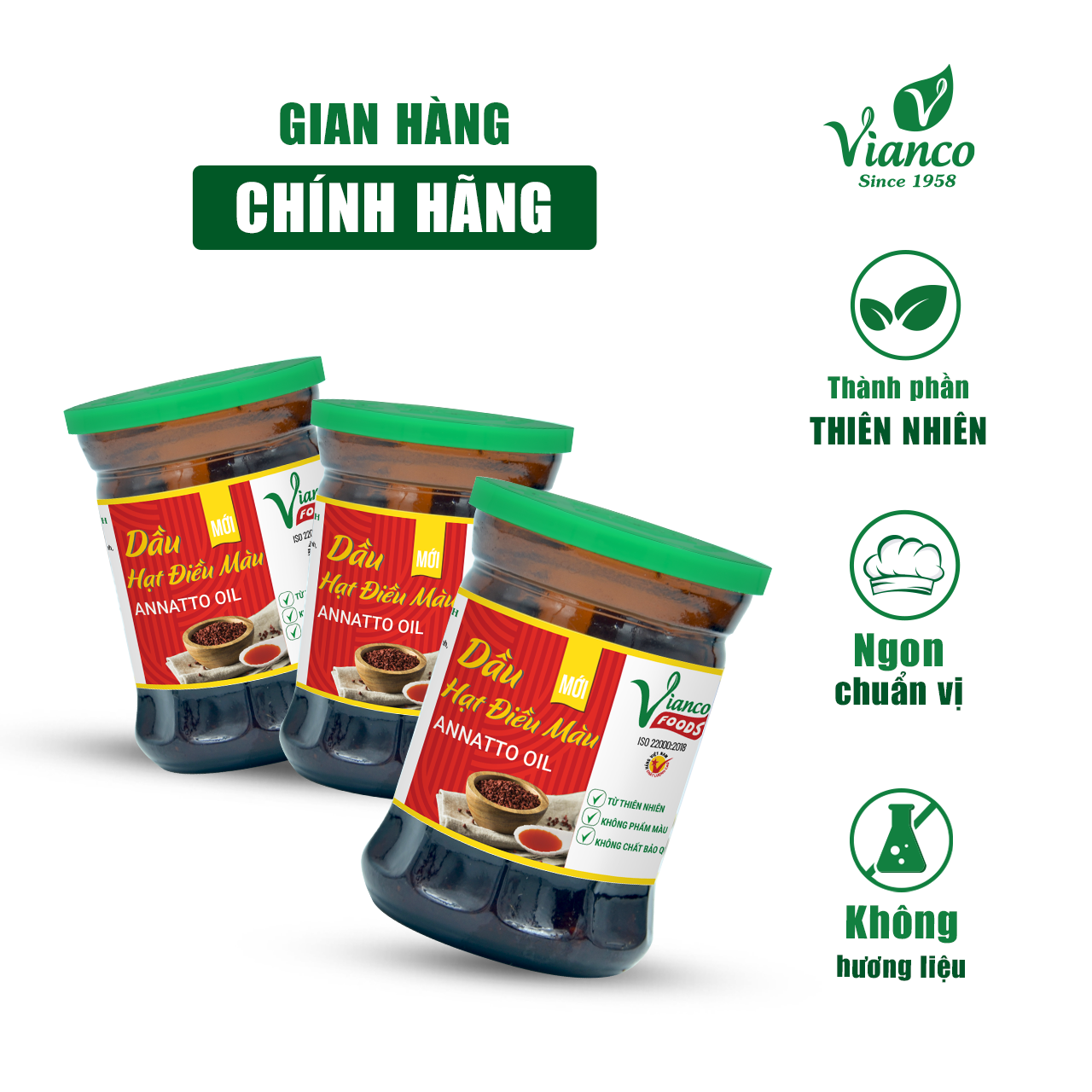 Mua tại TiktokDầu Điều màu ViancoFoods Việt Ấn dùng để nấu các món ăn cần có màu đỏ tươi, ướp vài muỗng dầu điều với các loại thịt, hải sản, cá cho các món chiên, xào, nướng BBQ, thịt quay và các món súp Bò kho, Bún Bò Huế, Bún Riêu,… tạo cho món ăn có màu sắc tươi đẹp và mùi vị thơm ngon Dầu hạt điều màu được chiết xuất từ quả của cây điều đỏ (hạt cà ri) là gia vị có nhiều tác dụng tuyệt vời trong Ẩm thực và sức khỏe. Vianco – Gia vị Việt Ấn cam kết: ** SẢN PHẨM THUẦN TỰ NHIÊN – 60% DẦU TINH LUYỆN, 40% HẠT ĐIỀU MÀU