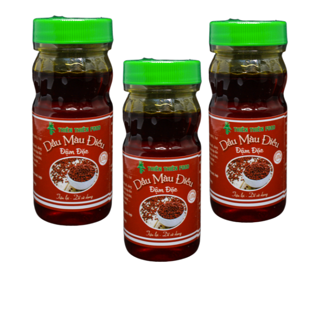 Mua tại TiktokDầu Màu Điều có tác dụng tạo màu cho món ăn mà không làm ảnh hưởng nhiều đến hương vị. Các món ăn có sử dụng Dầu Màu Điều luôn có màu đỏ đẹp mắt, kích thích vị giác. Dầu Màu Điều Thiên Thiên Food được chiết xuất từ quả của cây điều đỏ (hạt cà ri) là gia vị có nhiều tác dụng tuyệt vời trong Ẩm thực và sức khỏe. Sản phẩm được đóng gói trong chai Pet 100ml