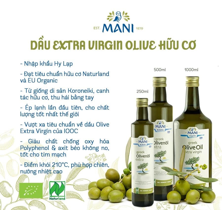 ✨Dầu Ô liu (Olive) ép lạnh nguyên chất hữu cơ chai 250ml 500ml 1L - Mani (Organic Extra Virgin Olive Oil)