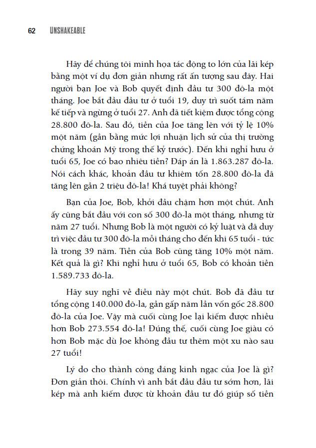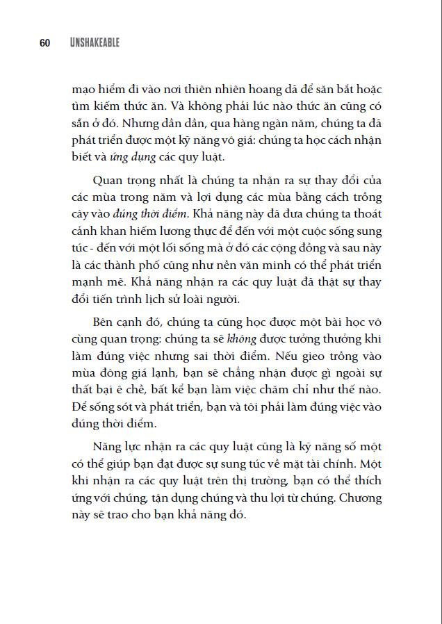 Sau khi phỏng vấn những chuyên gia tài chính và nhà đầu tư lừng lẫy nhất thế giới, Anthony Robbins đã đúc kết những bài học và bí quyết thành công của họ vào quyển sách này. Kết hợp với những lời khuyên giá trị từ Peter Mallouk, nhân vật duy nhất trong lịch sử tài chính được vinh danh là chuyên gia tư vấn tài chính hàng đầu thế giới trong ba năm liên tiếp, Unshakeable xứng đáng là quyển sách gối đầu giường về tự do tài chính.
