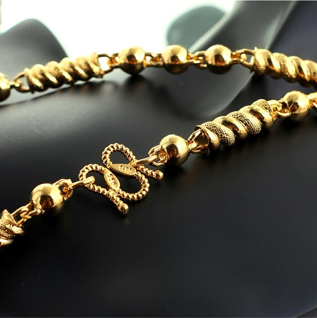 Với thiết kế sang trọng, những mắt xích với đường vân tỉ mỉ, dây chuyền mạ vàng 24k tạo sự mạnh mẽ nhưng không quá cứng nhắc.