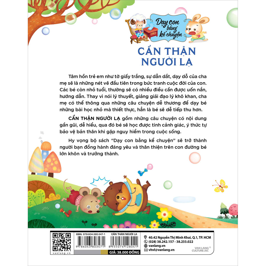 CẨN THẬN NGƯỜI LẠ gồm những câu chuyện có nội dung gần gũi, dễ hiểu, qua đó bé sẽ học được tính cảnh giác, ý thức tự bảo vệ bản thân khi gặp nguy hiểm trong cuộc sống.