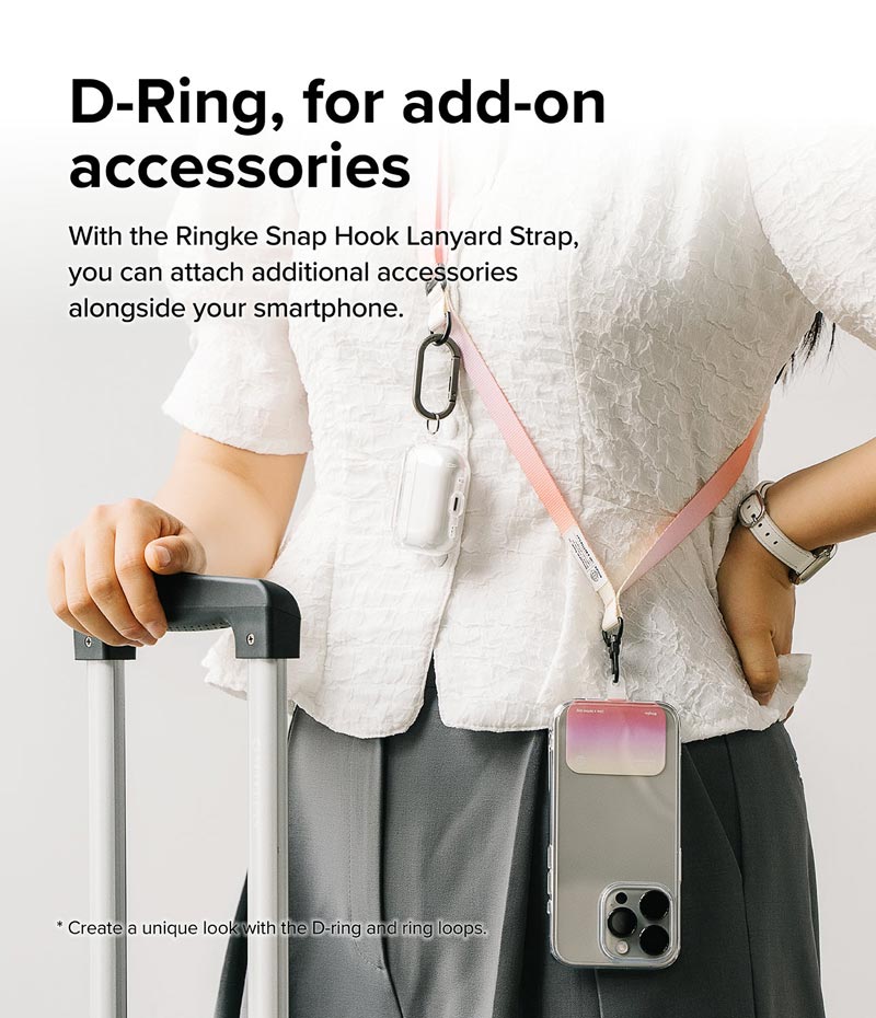 - Dây đeo Ringke Holder Link & Snap Hook Lanyard Strap là sự kết hợp độc đáo giữa hai dòng dây đeo bán chạy của Ringke: Holder Link Strap và Basic Lanyard Strap, có thể sử dụng được cho các dòng điện thoại khác nhau.