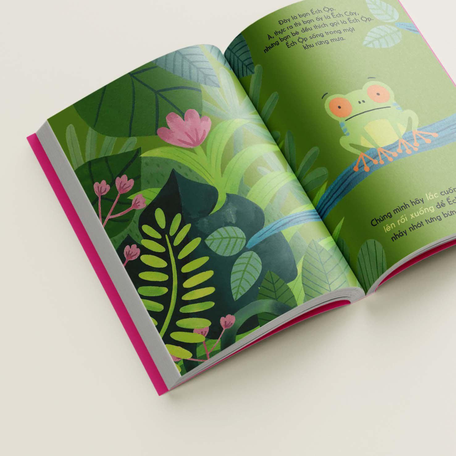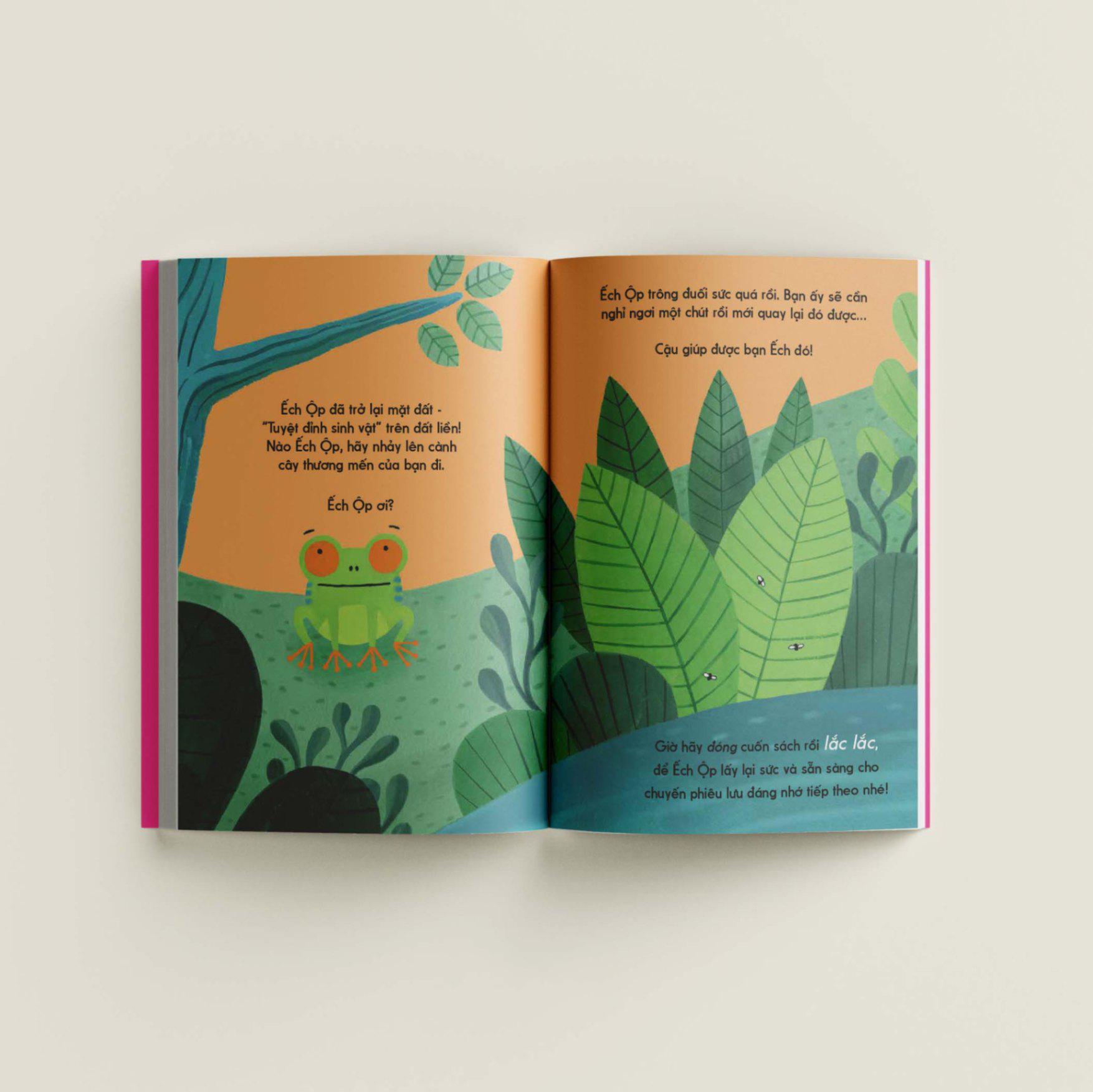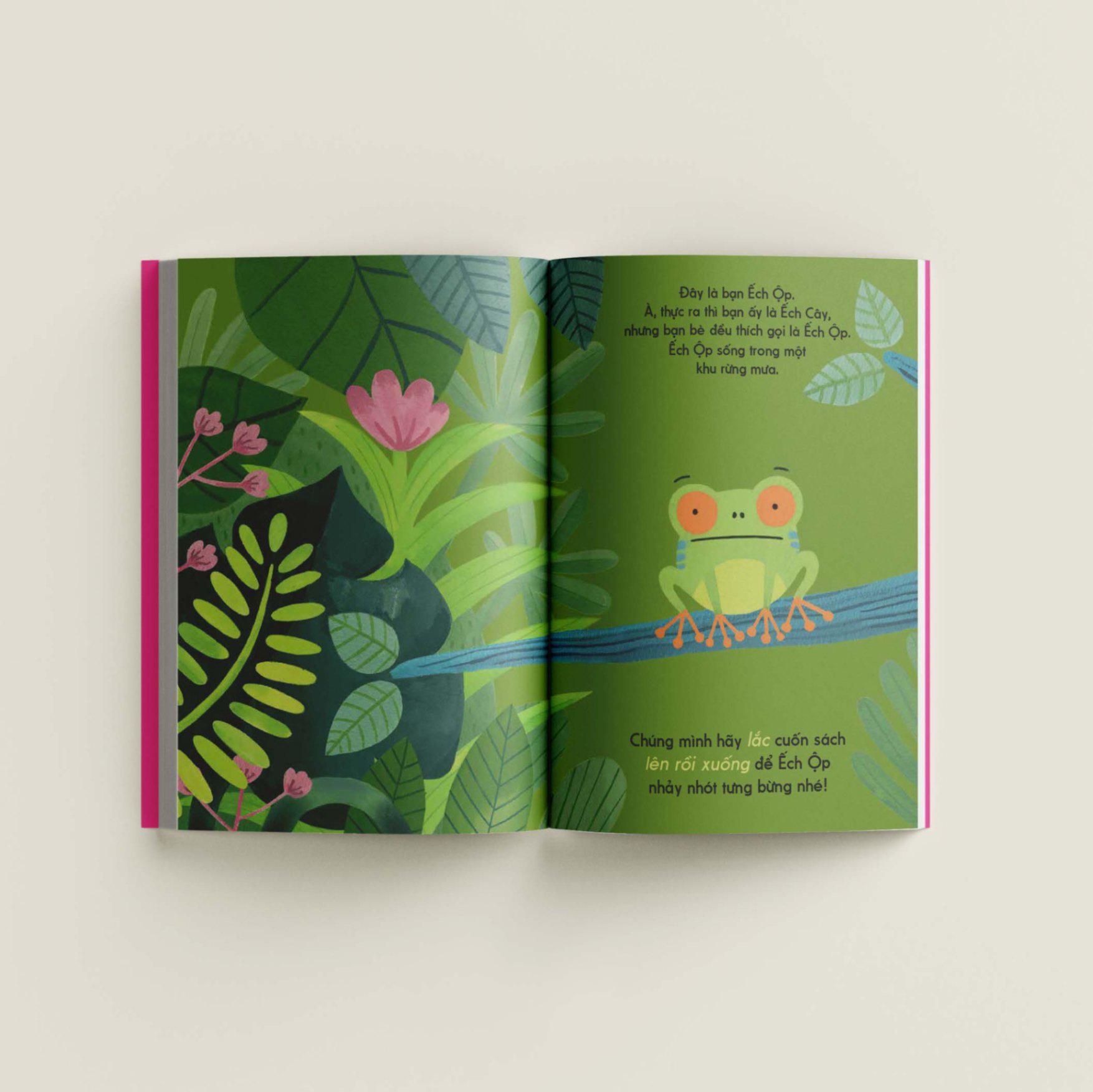 Trong cuốn sách này, em sẽ được gặp bạn Ếch Ộp. Đầu tiên em hãy lắc cuốn sách lên rồi xuống để Ếch Ộp nhảy nhót nhé. Úi cha, em lắc mạnh quá nên Ếch Ộp nhảy mất hút luôn rồi! Hãy để những ngón tay em chạy trên trang sách theo bóng Ếch Ộp nha. Ếch Ộp gặp ai thế kia? Một chú chim toucan không hề thiện chí chút nào. Em hãy lật giở các chiếc lá để giúp Ếch Ộp ẩn m.ình trốn khỏi chú chim gắt gỏng nhé.