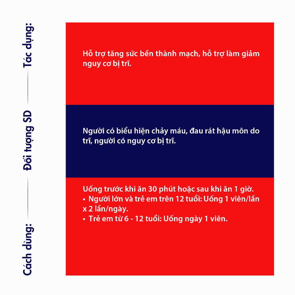 - Hỗ trợ giảm các triệu chứng của bệnh trĩ như: Đau rát, sưng vùng hậu môn, búi trĩ sa ra ngoài, chảy máu khi đại tiện.