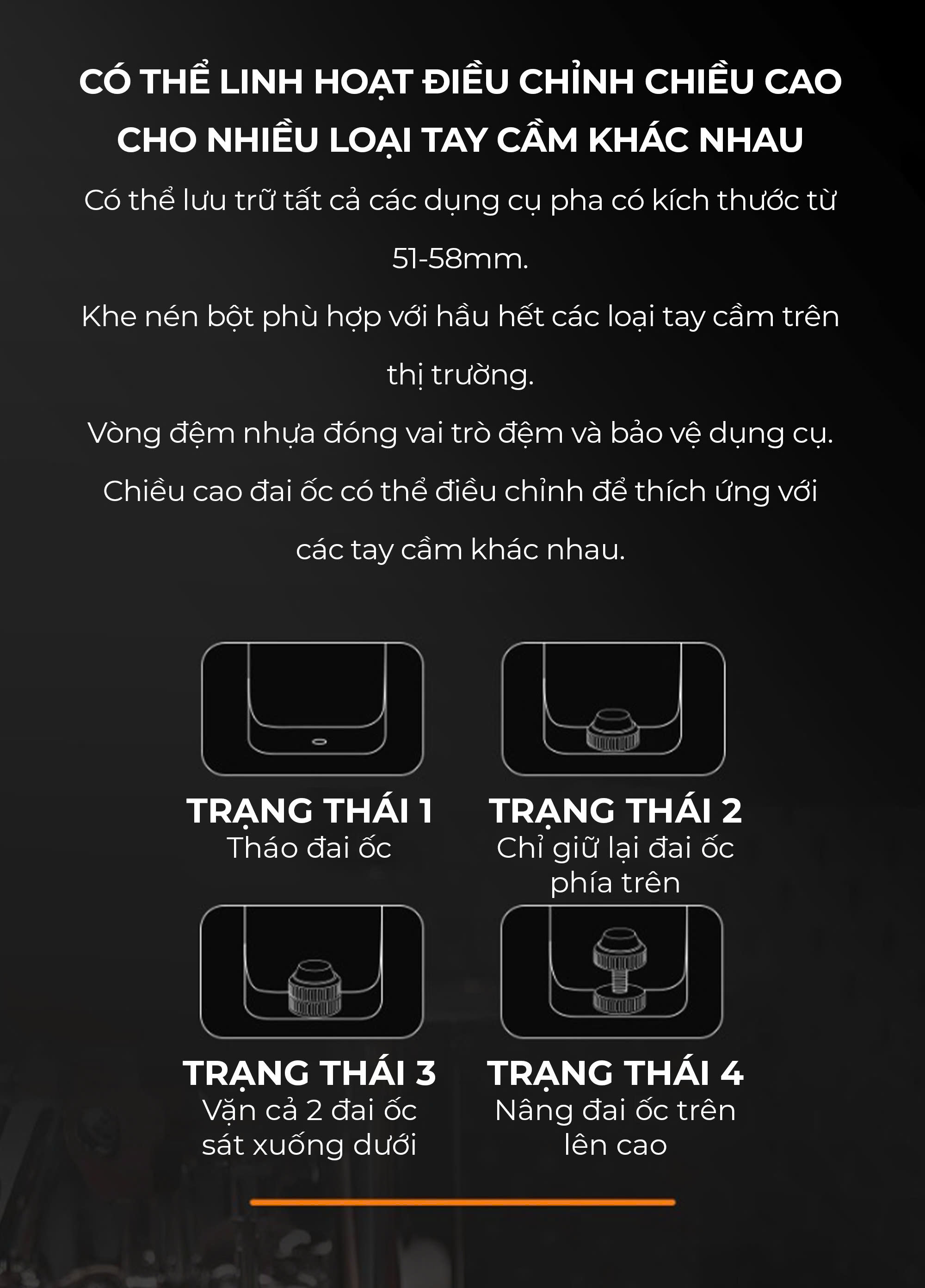 TẠI SAO BẠN NÊN CHỌN ĐẾ NÉN CÀ PHÊ GỖ ÓC CHÓ NAM MỸ? ️ Gỗ óc chó Nam Mỹ cao cấp, nổi bật với vân gỗ đẹp tự nhiên, độ bền cao, chống cong vênh, chịu lực tốt. ️ Bề mặt nhẵn mịn, không bám bẩn, chống thấm nước, giữ vệ sinh tối đa trong quá trình pha chế. ️ Dùng được cho hầu hết các loại tay cầm từ 51mm đến 58mm trên thị trường. ️ Hỗ trợ barista nén cà phê dễ dàng hơn, cân bằng hơn, tăng hiệu suất pha chế. ️ Thiết kế dựa trên chủng loại & kích thước của các thiết bị pha chế thông dụng. Tích hợp nhiều chức năng trong một sản phẩm như: Giá đỡ tay cầm nén cà phê Đỡ tamper, OCD,Kim Xoay(WDT) Ngăn đựng dụng cụ vệ sinh máy ️ Ngăn kéo linh hoạt với tích hợp nam châm từ tính giúp cố định chắc chắn. Khi di chuyển đế, ngăn kéo không bị trượt ra ngoài. ️ Đi kèm đai ốc điều chỉnh chiều cao, giúp tùy chỉnh phù hợp với nhiều loại tay cầm khác nhau. ️ Đế đỡ tương thích với hầu hết các loại tay cầm trên thị trường. ️ Tích hợp khe nhựa bảo vệ ngăn ngừa trầy xước đế khi sử dụng, ổn định và chống trầy.