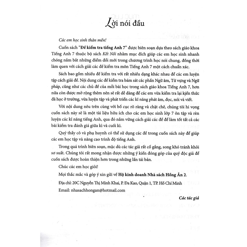 Với nội dung nêu trên cùng với bố cục rõ ràng và chặt chẽ, chúng tôi hi vọng cuốn sách này sẽ là một tài liệu hữu ích cho các em học sinh lớp 7 ôn tập và rèn luyện các kĩ năng tiếng Anh, qua đó nắm vững cách giải các đề để làm tốt tất cả các bài kiểm tra đánh giá giữa kì và cuối kì.