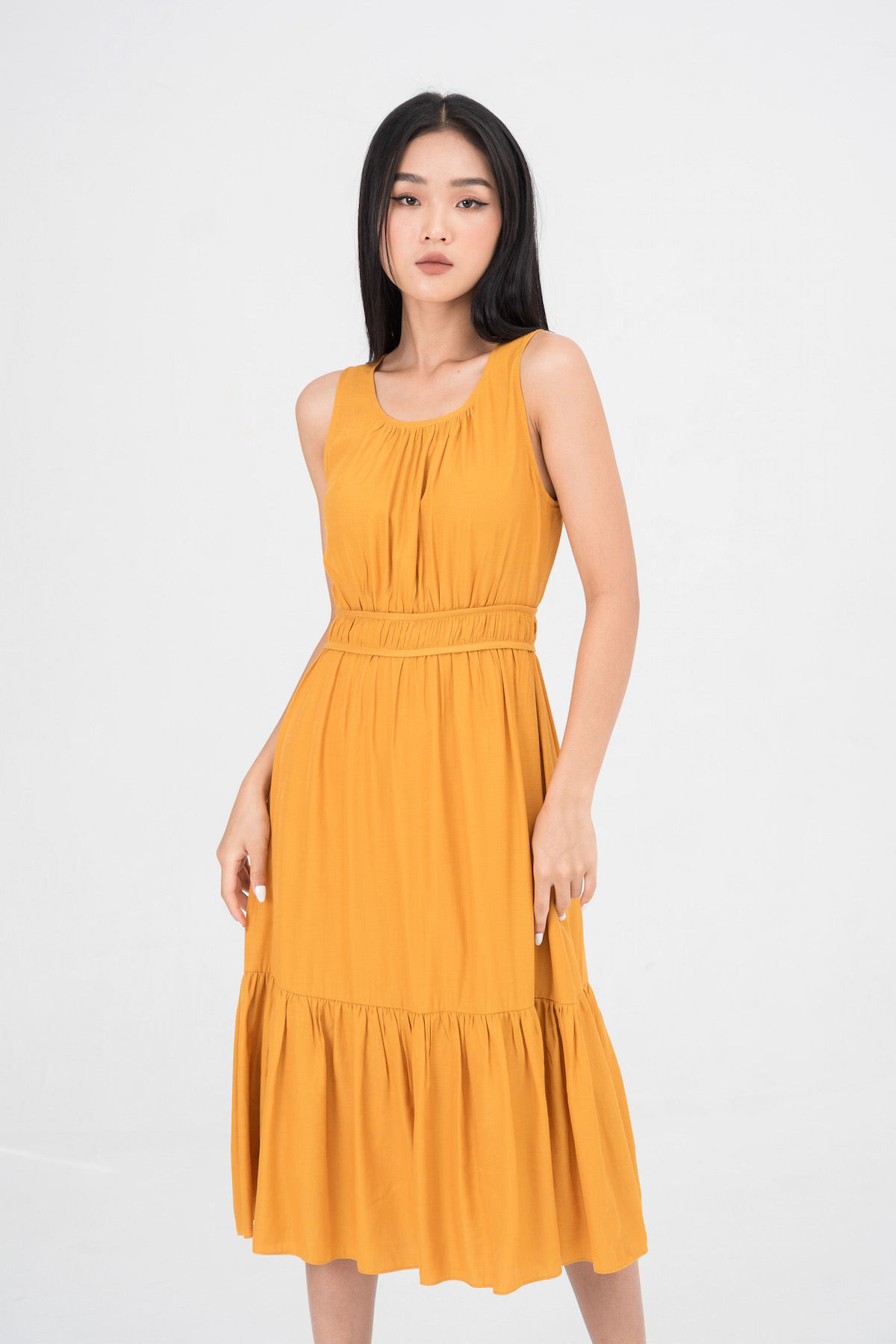 - Đầm dáng xoè, cổ tròn, cộc nách, gấu đuôi cá