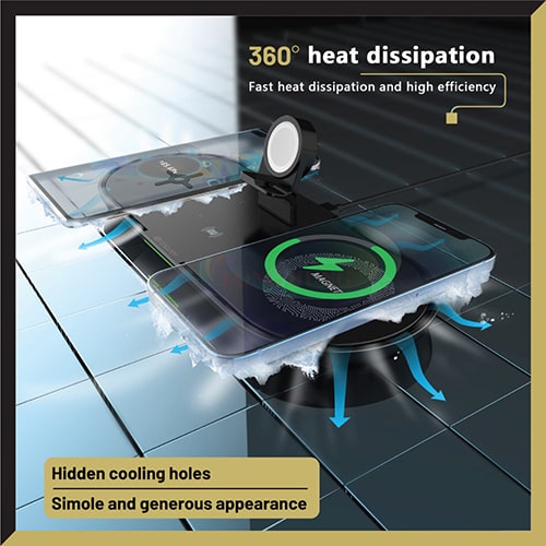 Lực hút nam châm tăng 20% so với các sản phẩm thông thường, giữ chặt thiết bị tương thích ngay cả khi di chuyển. Bạn có thể sạc ba thiết bị cùng lúc với một
