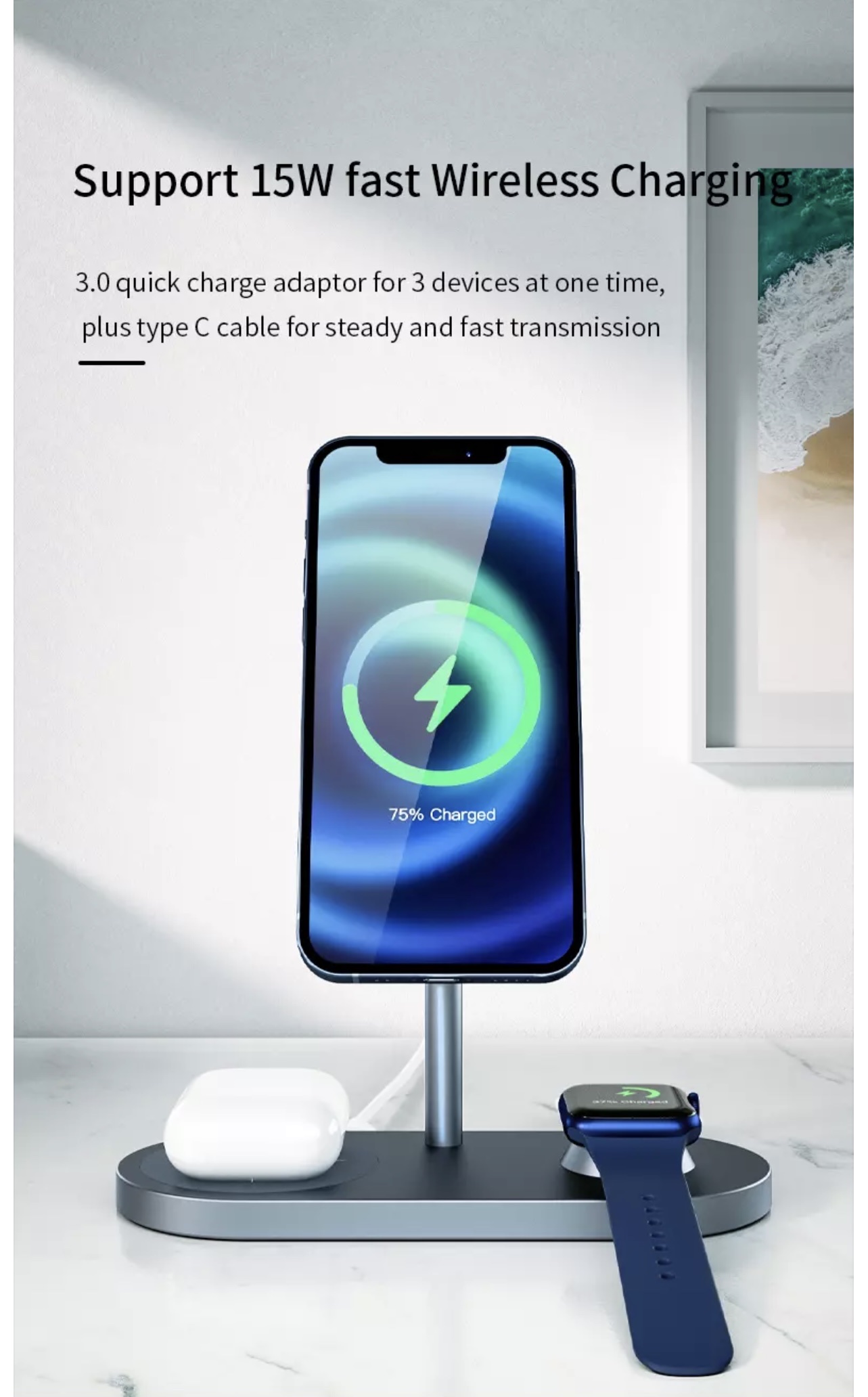 Hỗ trợ sạc nhanh không dây 15W, bộ chuyển đổi sạc nhanh 3.0 cho 3 thiết bị cùng một lúc, cùng với cáp loại C để truyền tải ổn định và nhanh chóng