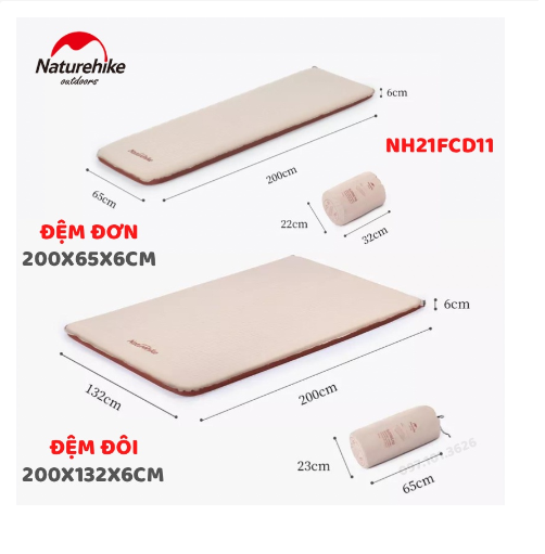 THÔNG TIN SẢN PHẨM: - Thương hiệu: Naturehike - Xuất xứ: Trung Quốc - Kích thước, trọng lượng: + Đệm đơn, dày 3cm: 192x65x3cm, 1.2kg + Đệm đơn, dày 6cm: 192x65x6cm, 1.7kg + Đệm đôi,