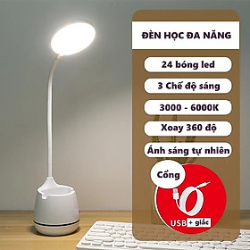 Đặc biệt có kệ để điện thoại tiện lợi lúc học tập hoặc làm việc Bộ sản phẩm gồm có: hộp sản phẩm, đèn, dây sạc chuyên dụng của nhà sản xuất (KHÔNG BAO GỒM CỦ SẠC) THÔNG TIN KHOA HỌC Ánh sáng LED được các nghiên cứu chỉ ra là loại ánh sáng phù hợp nhất với mắt người. Chọn đèn cung cấp đủ cả 3 loại ánh sáng là giải pháp vô cùng hữu hiệu, đa năng, tiện ích, và tiết kiệm