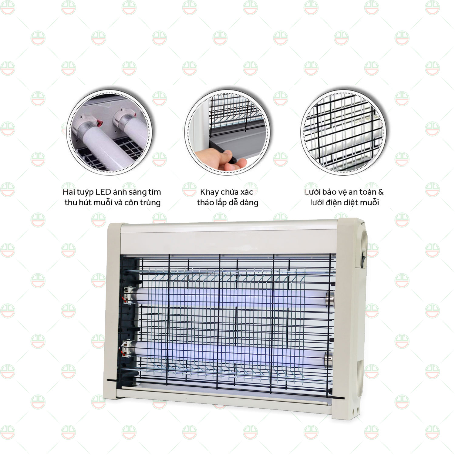 Đèn diệt côn trùng bằng lưới điện. Vỏ ngoài: Nhựa Điện áp: AC 220V - 50Hz Bóng đèn: 8W x 2 Phạm vi hiệu quả: 60m2 Kích thước: 35 x 10 x 28 cm Khối