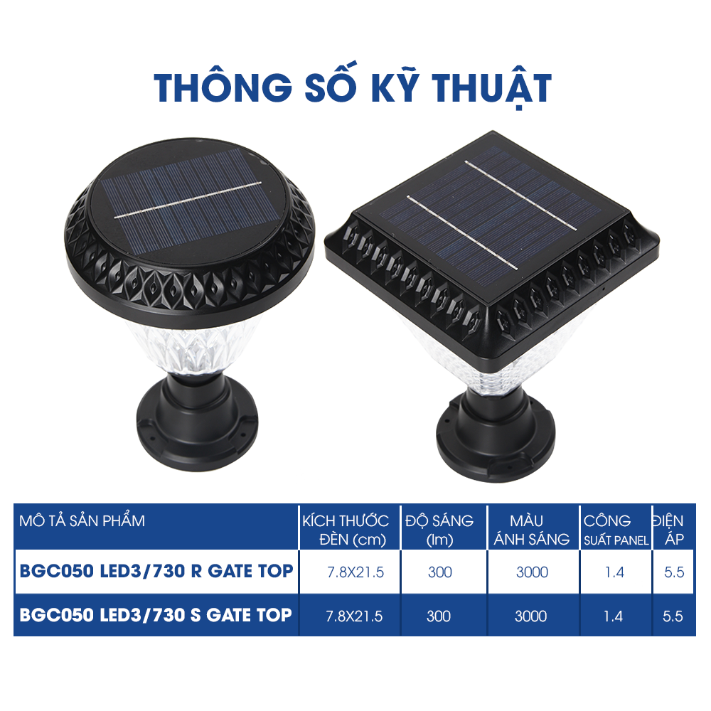 Đèn cổng Philips Deco solar gate top BGC050 LED3/730 Gate Top có hai thiết kế vuông (S) và tròn (R). Đèn chạy bằng năng lượng mặt trời rất lý tưởng để thắp sáng ngôi nhà và khu vườn của bạn. Thông minh và phong cách, đèn cổng Philips Deco dễ dàng lắp đặt để tiếp cận với nguồn ánh sáng mặt trời, tiêu thụ ít điện năng và bền bỉ.   Điểm đặc biệt • Môi trường chiếu sáng ngoài trời nơi không thể kết nối điện • Cấu hình dễ dàng theo nhu cầu người dùng • Tất cả các phụ kiện đi kèm trong cùng 1 hộp, có thể tự lắp đặt • Điện áp thấp, an toàn sử dụng   Lý do chọn sản phẩm • Hệ thống điện mặt trời độc lập • Bao gồm điều khiển từ xa cho một số chế độ • Bảng PV và pin Li tích hợp trong đèn.   Thông số kỹ thuật • Quang hiệu: 140 Lm/W • Quang thông: 300 lumens • Công suất: 1.4 • Điện áp: 5.5 V • Tuổi thọ: LED > 25k Hrs  • Li-battery 3.7V/2000mAh • Bảng điều khiển năng lượng mặt trời: vuông: 1.8W; tròn: 1.1W • Vỏ: ABS • IP65 • CRI >70 • CCT 3000K • Cấu hình với điều khiển từ xa: Bật, Tắt, 12H, 6H, 3H hoạt động