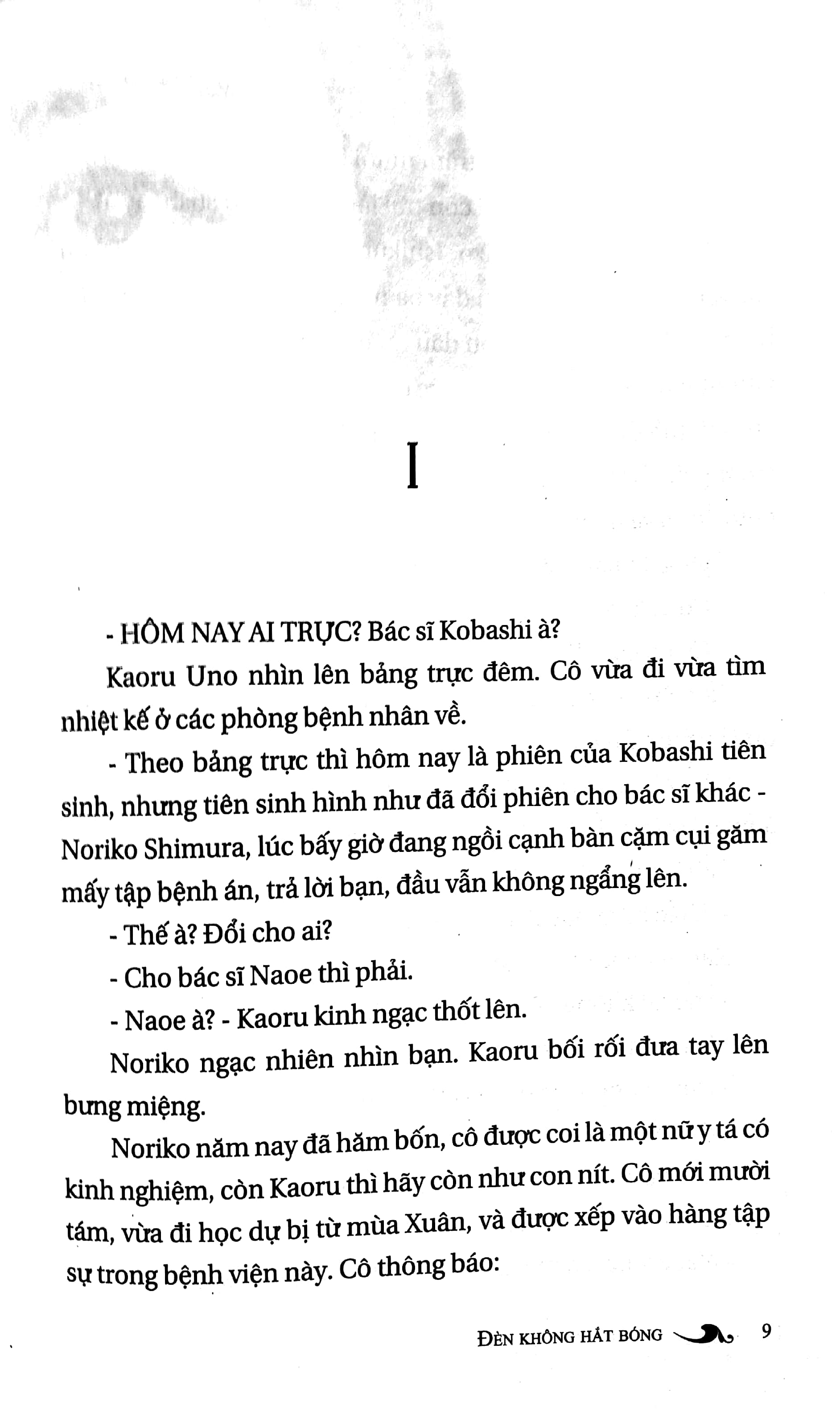 Đèn Không Hắt Bóng không đơn thuần kể về đời sống bệnh viện. Nhìn ở góc độ khác, nó là câu chuyện tình yêu lạnh lùng, bí ẩn và đau đớn. Mối quan hệ giữa Noriko và bác sĩ Naoê phải chăng là tình yêu một chiều? Đứng bên cạnh vị bác sĩ tài hoa, hình ảnh của Noriko khá lặng lẽ. Yêu Naoê, tự nguyện gắn bó với anh, cô vẫn phải chứng kiến hàng loạt mối quan hệ bất thường của Naoê với những phụ nữ khác, từ vợ và con gái của bác sĩ viện trưởng, cô gái quán bar, cho đến nàng ca sĩ ngôi sao… Nhưng đau khổ hơn hết, cô nhận ra Naoê là một pháo đài riêng, không cho cô thâm nhập, ngay cả những giây phút gần gũi nhất cả về thân xác lẫn tình cảm.