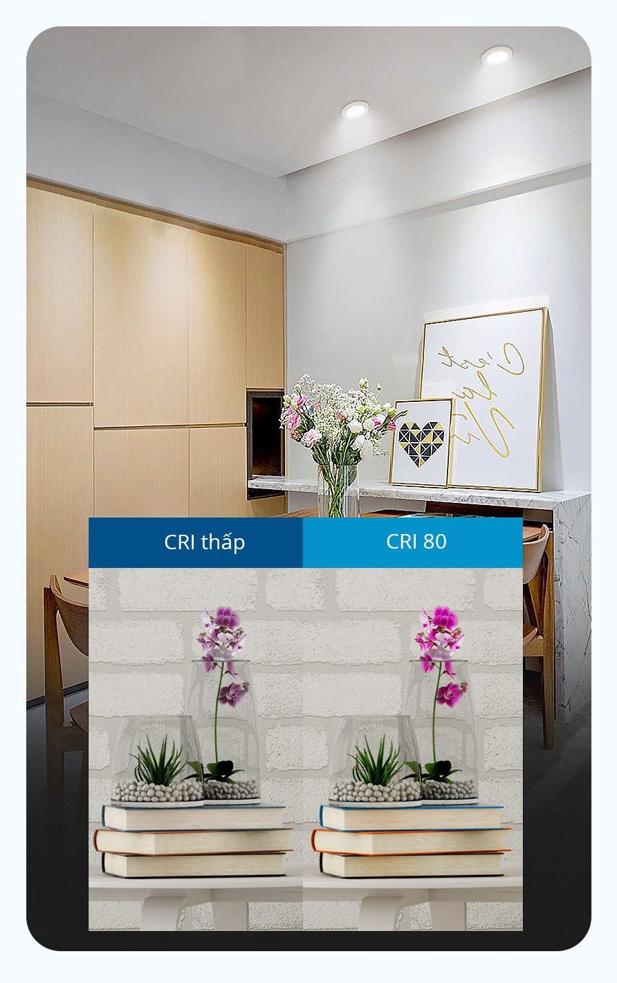 - Chỉ số hoàn màu CRI 80, phản ánh màu sắc trung thực, gần với tự nhiên.