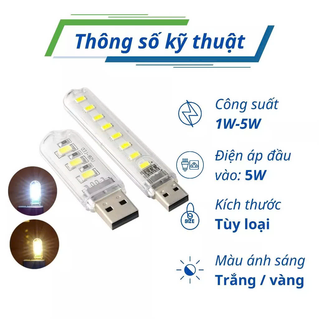 - Đèn LED USB 8 mắt LED: 10.1 x 1.8 x 0.9 cm