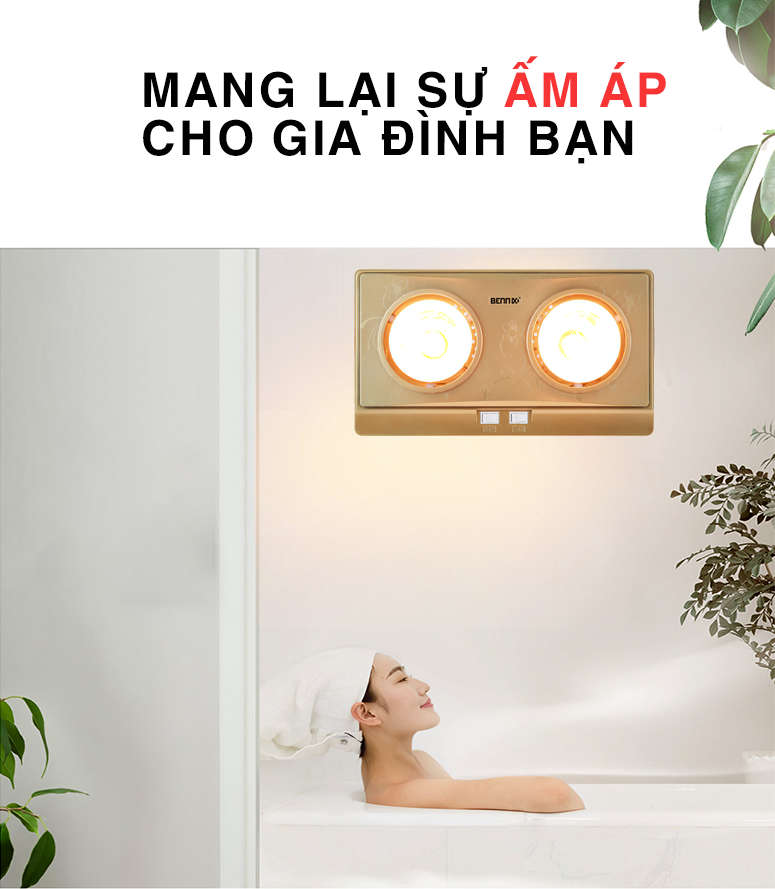 - Dễ dàng sử dụng Đèn sưởi nhà tắm 2 bóng Bennix BN-02G có 2 công tắc tắt mở, mỗi công tắc điều khiển 1 bóng đèn. Sử dụng đèn 1 hay 2 bóng để điều chỉnh nhiệt độ tùy ý người dùng. Mùa đông của miền Bắc luôn khắc nghiệt. Đặc biệt cái lạnh cắt da cắt thịt khi sử dụng nhà tắm có thể ảnh hưởng sức khỏe, nhất là đối với người già và trẻ nhỏ. Chính vì vậy, đèn sưởi Bennix sẽ là sự lựa chọn tin cậy để làm ấm không gian phòng tắm, để bạn có những thời gian thư thái nhất khi tắm.
