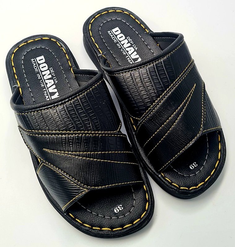 Dép Da Nam - Lịch Lãm & Thoải Mái Mỗi Ngày - Chất liệu cao cấp: Sử dụng da tổng hợp chất lượng, mềm mại, bền bỉ theo thời gian, mang lại cảm giác êm ái và thoáng khí cho bàn chân. - Thiết kế sang trọng: Tông màu đen lịch lãm, kết hợp với đường chỉ may tinh tế và logo kim loại nổi bật – tôn lên vẻ nam tính, trưởng thành. - Đế chống trượt: Đế EVA siêu nhẹ, độ đàn hồi tốt, kết hợp vân đế tăng độ ma sát – an toàn khi di chuyển trên nhiều bề mặt. - Form ôm chân: Thiết kế bản quai ngang rộng, ôm gọn bàn chân nhưng không gây bí bách, dễ xỏ vào – thích hợp cho người trung niên và người lớn tuổi. - Ứng dụng đa năng: Phù hợp sử dụng trong nhà, đi dạo phố, đến văn phòng hoặc các dịp gặp gỡ thân mật. Lựa chọn tuyệt vời cho quý ông yêu thích sự thoải mái, đơn giản nhưng vẫn giữ được nét tinh tế trong từng bước chân.