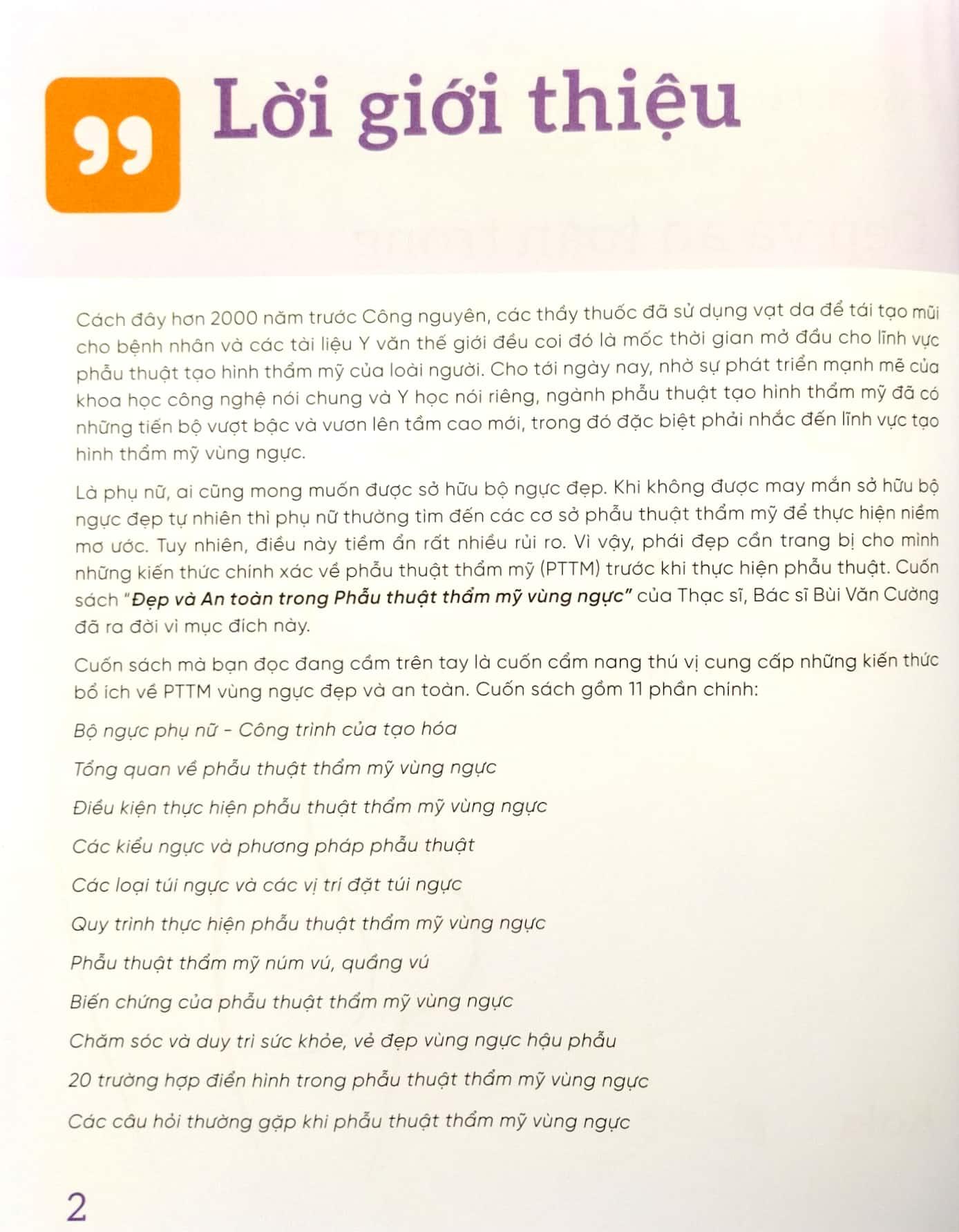 Với mục đích truyền tải cho bạn đọc những thông tin cơ bản, hữu ích về PTTM vùng ngực, hi vọng cuốn cẩm nang này sẽ là người bạn tin cậy cho tất cả mọi người để những ai đã và đang quan tâm tới lĩnh vực PTTM vùng ngực có thể tự tin làm đẹp một cách an toàn, lựa chọn cơ sở thẩm mỹ uy tín, phù hợp với bản thân.